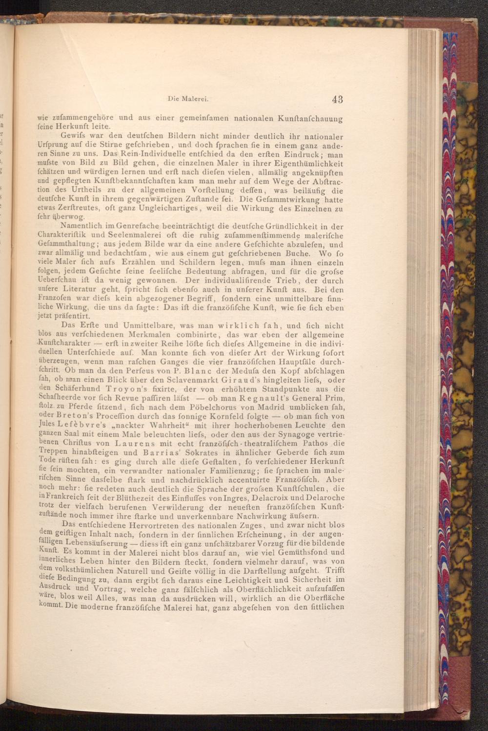 Das entfchiedene Hervortreten des nationalen Zuges, und zwar nicht blos dem geiftigen Inhalt nach, fondern in der finnlichen Erfcheinung, in der augenfälligen Lebensäufserung- diess ift ein ganz unfchätzbarer Vorzug für die bildende Kunft. Es kommt in der Malerei nicht blos darauf an, wie viel Gemüthsfond und innerliches Leben hinter den Bildern fteckt, fondern vielmehr darauf, was von dem volksthümlichen Naturell und Geifte völlig in die Darftellung aufgeht. Trifft diefe Bedingung zu, dann ergibt fich daraus eine Leichtigkeit und Sicherheit im Ausdruck und Vortrag, welche ganz fälfchlich als Oberflächlichkeit aufzufaffen wäre, blos weil Alles, was man da ausdrücken will, wirklich an die Oberfläche kommt. Die moderne franzöfifche Malerei hat, ganz abgefehen von den fittlichen