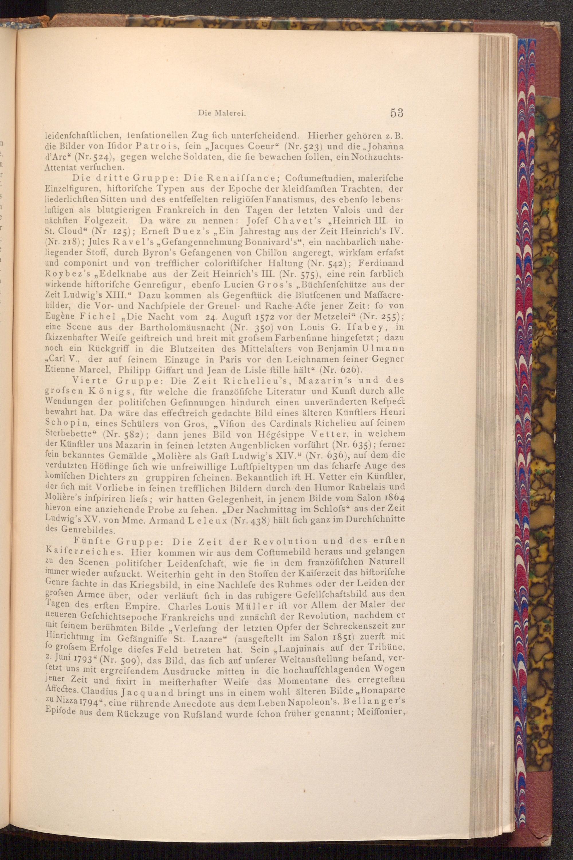 Fünfte Gruppe: Die Zeit der Revolution und des erften Kaiferreiches. Hier kommen wir aus dem Coftumebild heraus und gelangen zu den Scenen politifcher Leidenfchaft, wie fie in dem franzöfifchen Naturell immer wieder aufzuckt. Weiterhin geht in den Stoffen der Kaiferzeit das hiftorifche Genre fachte in das Kriegsbild, in eine Nachlefe des Ruhmes oder der Leiden der grofsen Armee über, oder verläuft fich in das ruhigere Gefellfchaftsbild aus den Tagen des erften Empire. Charles Louis Müller ift vor Allem der Maler der neueren Gefchichtsepoche Frankreichs und zunächft der Revolution, nachdem er mit feinem berühmten Bilde„ Verlefung der letzten Opfer der Schreckenszeit zur Hinrichtung im Gefängniffe" St. Lazare"( ausgeftellt im Salon 1851) zuerst mit fo grofsem Erfolge diefes Feld betreten hat. Sein„ Lanjuinais auf der Tribüne, 2. Juni 1793"( Nr. 509), das Bild, das fich auf unferer Weltausftellung befand, verfetzt uns mit ergreifendem Ausdrucke mitten in die hochauffchlagenden Wogen jener Zeit und fixirt in meiſterhafter Weife das Momentane des erregteften Affectes. Claudius Jacquand bringt uns in einem wohl älteren Bilde ,, Bonaparte zu Nizza 1794", eine rührende Anecdote aus dem Leben Napoleon's. Bellanger's Epiſode aus dem Rückzuge von Rufsland wurde fchon früher genannt; Meiffonier,