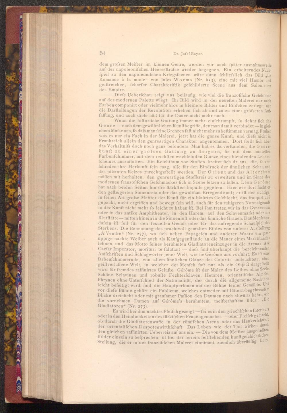 Es wird bei ihm nacktes Fleiſch gezeigt- fei es in den griechifchen Interieurs oder in den Heimlichkeiten des türkifchen Frauengemaches- oder Fleiſch gemacht, ob durch die Gladiatorenwaffe in der römifchen Arena oder das Henkerfchwert der orientalifchen Despotenwirthschaft. Das Leben wie der Tod wirken durch den gleichen raffinirten Ueberreiz auf uns ein.- Die von dem Meifter ausgeftellten Bilder einzeln zu befprechen, ift bei der bereits feftftehenden kunftgefchichtlichen Stellung, die er in der franzöfifchen Malerei einnimmt, ziemlich überflüffig. Unter