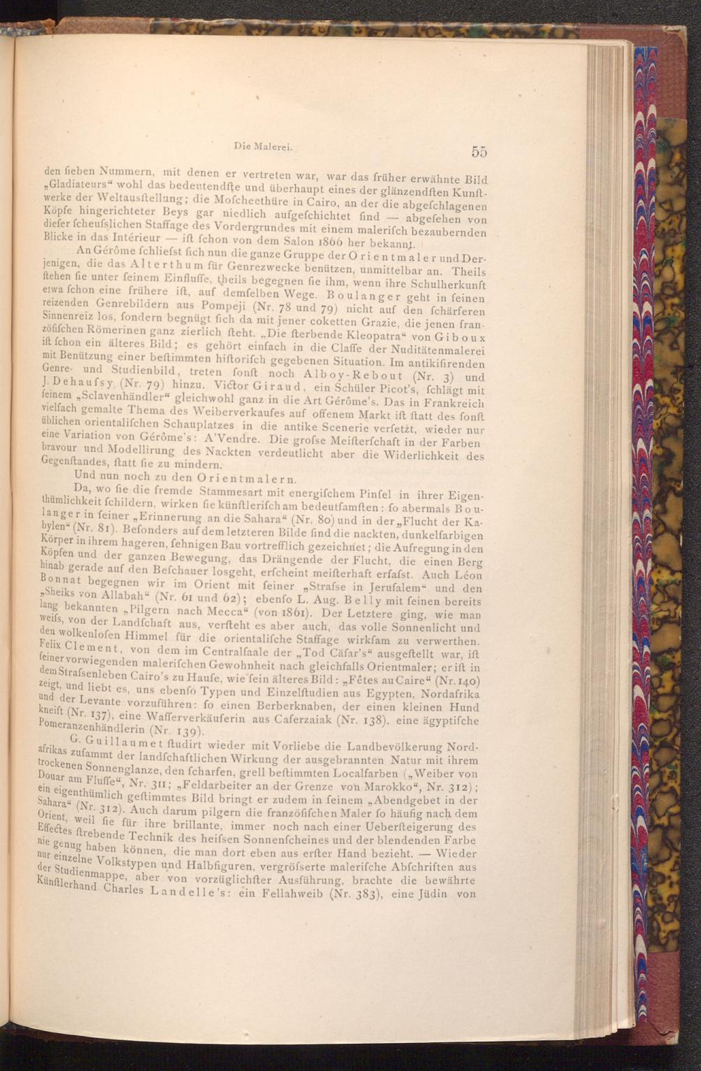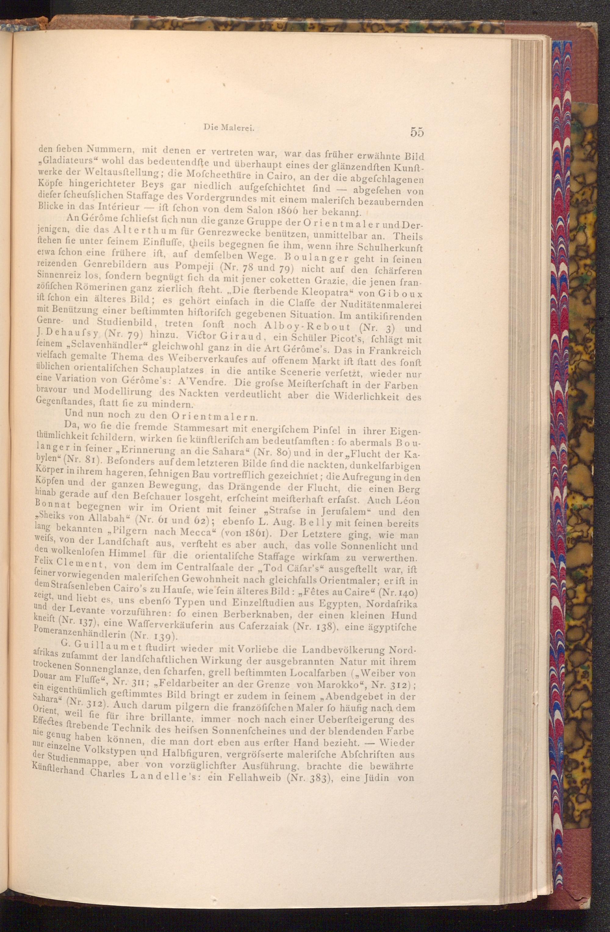 55 den fieben Nummern, mit denen er vertreten war, war das früher erwähnte Bild Gladiateurs" wohl das bedeutendfte und überhaupt eines der glänzendften Kunftwerke der Weltausftellung; die Mofcheethüre in Cairo, an der die abgefchlagenen Köpfe hingerichteter Beys gar niedlich aufgefchichtet find- diefer fcheufslichen Staffage des Vordergrundes mit einem malerifch bezaubernden abgefehen von Blicke in das Intérieur ift fchon von dem Salon 1866 her bekannt.