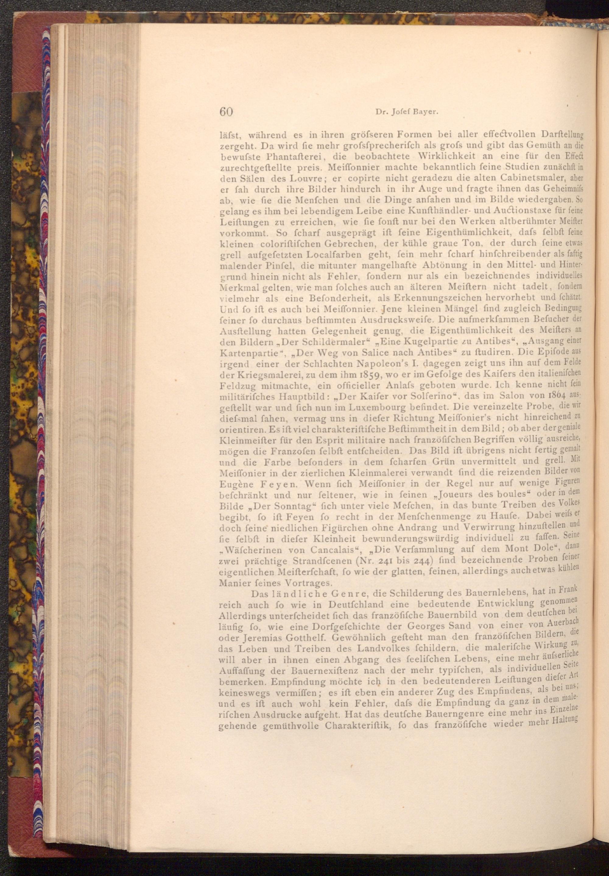 Das ländliche Genre, die Schilderung des Bauernlebens, hat in Frank reich auch fo wie in Deutſchland eine bedeutende Entwicklung genommen Allerdings unterfcheidet fich das franzöfifche Bauernbild von dem deutſchen bei läufig fo, wie eine Dorfgefchichte der Georges Sand von einer von Auerbach oder Jeremias Gotthelf. Gewöhnlich gefteht man den franzöfifchen Bildern, die das Leben und Treiben des Landvolkes fchildern, die malerifche Wirkung zu, will aber in ihnen einen Abgang des feelifchen Lebens, eine mehr äufserliche Auffaffung der Bauernexiftenz nach der mehr typifchen, als individuellen Seite bemerken. Empfindung möchte ich in den bedeutenderen Leiftungen diefer Art keineswegs vermiffen; es ift eben ein anderer Zug des Empfindens, als bei uns; und es ift auch wohl kein Fehler, dafs die Empfindung da ganz in dem male. rifchen Ausdrucke aufgeht. Hat das deutſche Bauerngenre eine mehr ins Einzelne gehende gemüthvolle Charakteriſtik, fo das franzöfifche wieder mehr Haltung