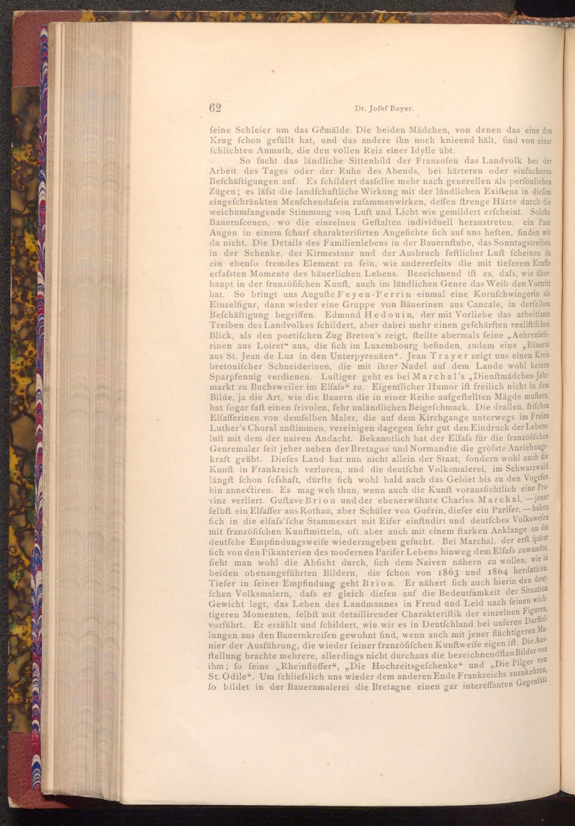 So fucht das ländliche Sittenbild der Franzofen das Landvolk bei der Arbeit des Tages oder der Ruhe des Abends, bei härteren oder einfacheren Befchäftigungen auf. Es fchildert dasfelbe mehr nach generellen als perfönlichen Zügen; es läfst die landfchaftliche Wirkung mit der ländlichen Existenz in diefem eingefchränkten Menfchendafein zufammenwirken, deffen ftrenge Härte durch die weichumfangende Stimmung von Luft und Licht wie gemildert erfcheint. Solche Bauernfcenen, wo die einzelnen Geftalten individuell heraustreten, ein Paar Augen in einem fcharf charakterifirten Angefichte fich auf uns heften, finden wir da nicht. Die Details des Familienlebens in der Bauernftube, das Sonntagstreiben in der Schenke, der Kirmestanz und der Ausbruch feftlicher Luft fcheinen da ein ebenfo fremdes Element zu fein, wie andererfeits die mit tieferem Ernfte erfafsten Momente des bäuerlichen Lebens. Bezeichnend ift es, dafs, wie über haupt in der franzöfifchen Kunft, auch im ländlichen Genre das Weib den Vortritt hat. So bringt uns Augufte Feyen- Perrin einmal eine Kornfchwingerin als Einzelfigur, dann wieder eine Gruppe von Bäuerinen aus Cancale, in derfelben Befchäftigung begriffen. Edmund Hedouin, der mit Vorliebe das arbeitfame Treiben des Landvolkes fchildert, aber dabei mehr einen gefchärften realiftifchen Blick, als den poetifchen Zug Breton's zeigt, ftellte abermals feine ,, Aehrenleferinen aus Loiret" aus, die fich im Luxembourg befinden, zudem eine„ Bäuerin aus St. Jean de Luz in den Unterpyrenäen". Jean Trayer zeigt uns einen Kreis bretonischer Schneiderinen, die mit ihrer Nadel auf dem Lande wohl keinen Sparpfennig verdienen. Luftiger geht es bei Marchal's ,, Dienftmädchen- Jahrmarkt zu Buchsweiler im Elfafs" zu. Eigentlicher Humor ift freilich nicht in dem Bilde, ja die Art, wie die Bauern die in einer Reihe aufgeftellten Mägde muftern, hat fogar faft einen frivolen, fehr unländlichen Beigefchmack. Die drallen, frifchen Elfafferinen von demfelben Maler, die auf dem Kirchgange unterwegs im Freien Luther's Choral anftimmen, vereinigen dagegen fehr gut den Eindruck der Lebens. luft mit dem der naiven Andacht. Bekanntlich hat der Elfafs für die franzöfifchen Genremaler feit jeher neben der Bretagne und Normandie die gröfste Anziehungs kraft geübt. Diefes Land hat nun nicht allein der Staat, fondern wohl auch die Kunft in Frankreich verloren, und die deutfche Volksmalerei, im Schwarzwald längft fchon fefshaft, dürfte fich wohl bald auch das Gebiet bis zu den Vogefen hin annectiren. Es mag weh thun, wenn auch die Kunft vorausfichtlich eine Provinz verliert. Guftave Brion und der ebenerwähnte Charles Marchal,-jener felbft ein Elfaffer aus Rothau, aber Schüler von Guérin, diefer ein Parifer,- haben fich in die elfafs'fche Stammesart mit Eifer einftudirt und deutfches Volkswefen mit franzöfifchen Kunftmitteln, oft, aber auch mit einem ftarken Anklange an die deutfche Empfindungsweife wiederzugeben gefucht. Bei Marchal, der erft fpäter fich von den Pikanterien des modernen Parifer Lebens hinweg dem Elfafs zuwandte, fieht man wohl die Abficht durch, fich dem Naiven nähern zu wollen, wie in beiden obenangeführten Bildern, die fchon von 1863 und 1864 herdatiren. Tiefer in feiner Empfindung geht Brion. Er nähert fich auch hierin den deut fchen Volksmalern, dafs er gleich diefen auf die Bedeutfamkeit der Situation Gewicht legt, das Leben des Landmannes in Freud und Leid nach feinen wichtigeren Momenten, felbft mit detaillirender Charakteriſtik der einzelnen Figuren, vorführt. Er erzählt und fchildert, wie wir es in Deutſchland bei unferen Darftel lungen aus den Bauernkreifen gewohnt find, wenn auch mit jener flüchtigeren nier der Ausführung, die wieder feiner franzöfifchen Kunstweife eigen ift. Die Ausftellung brachte mehrere, allerdings nicht durchaus die bezeichnendften Bilder von ihm; fo feine„, Rheinflöffer",„ Die Hochzeitsgefchenke" und„ Die Pilger St. Odile". Um fchliesslich uns wieder dem anderen Ende Frankreichs zuzukehren, fo bildet in der Bauernmalerei die Bretagne einen gar intereffanten Gegenfatz
