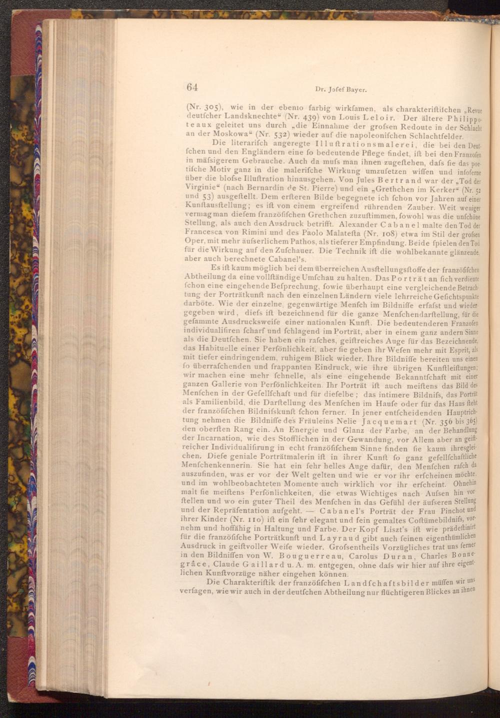 Es ist kaum möglich bei dem überreichen Ausftellungsftoffe der franzöfifchen Abtheilung da eine vollſtändige Umfchau zu halten. Das Porträt an fich verdiente fchon eine eingehende Befprechung, fowie überhaupt eine vergleichende Betrachtung der Porträtkunft nach den einzelnen Ländern viele lehrreiche Gefichtspunkte darböte. Wie der einzelne, gegenwärtige Menfch im Bildniffe erfafst und wieder gegeben wird, diefs ift bezeichnend für die ganze Menfchen darftellung, für die gefammte Ausdrucksweife einer nationalen Kunft. Die bedeutenderen Franzofen individualifiren fcharf und fchlagend im Porträt, aber in einem ganz andern Sinne als die Deutfchen. Sie haben ein rafches, geiftreiches Auge für das Bezeichnende, das Habituelle einer Perfönlichkeit, aber fie geben ihr Wefen mehr mit Esprit, als mit tiefer eindringendem, ruhigem Blick wieder. Ihre Bildniffe bereiten uns einen fo überraschenden und frappanten Eindruck, wie ihre übrigen Kunftleiftungen; wir machen eine mehr fchnelle, als eine eingehende Bekanntfchaft mit einer ganzen Gallerie von Perfönlichkeiten. Ihr Porträt ift auch meiftens das Bild des Menfchen in der Gefellſchaft und für diefelbe; das intimere Bildnifs, das Porträt als Familienbild, die Darftellung des Menfchen im Haufe oder für das Haus ſteht der franzöfifchen Bildnifskunft fchon ferner. In jener entfcheidenden Hauptrichtung nehmen die Bildniffe des Fräuleins Nelie Jacquemart( Nr. 356 bis 365) den oberften Rang ein. An Energie und Glanz der Farbe, an der Behandlung der Incarnation, wie des Stofflichen in der Gewandung, vor Allem aber an geift. reicher Individualifirung in echt franzöfifchem Sinne finden fie kaum ihresglei chen. Diefe geniale Porträtmalerin ift in ihrer Kunft fo ganz gefellſchaftliche Menfchenkennerin. Sie hat ein fehr helles Auge dafür, den Menfchen rafch da auszufinden, was er vor der Welt gelten und wie er vor ihr erfcheinen möchte. und im wohlbeobachteten Momente auch wirklich vor ihr erfcheint. Ohnehin malt fie meiftens Perfönlichkeiten, die etwas Wichtiges nach Aufsen hin vor ftellen und wo ein guter Theil des Menfchen in das Gefühl der äufseren Stellung und der Repräfentation aufgeht.- Cabanel's Porträt der Frau Pinchot und ihrer Kinder( Nr. 110) ift ein fehr elegant und fein gemaltes Coftümebildnifs, vor nehm und hoffähig in Haltung und Farbe. Der Kopf Liszt's ift wie prädeftinirt für die franzöfifche Porträtkunft und Layraud gibt auch feinen eigenthümlichen Ausdruck in geiftvoller Weife wieder. Grofsentheils Vorzügliches trat uns ferner in den Bildniffen von W. Bouguerreau, Carolus Duran, Charles Bonne grâce, Claude Gaillard u. A. m. entgegen, ohne dafs wir hier auf ihre eigent lichen Kunftvorzüge näher eingehen können.