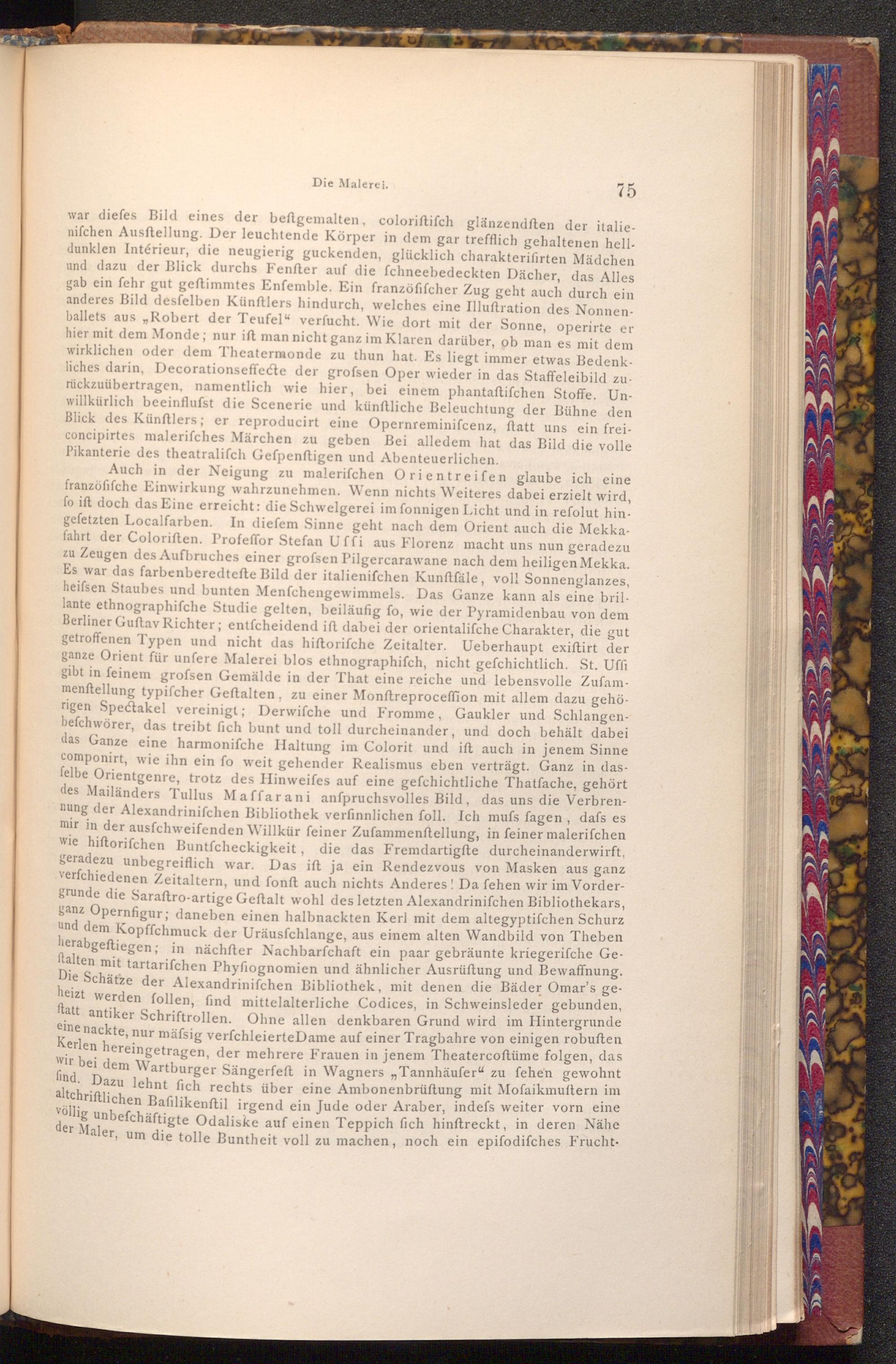 Auch in der Neigung zu malerifchen Orientreifen glaube ich eine franzöfifche Einwirkung wahrzunehmen. Wenn nichts Weiteres dabei erzielt wird, fo ift doch das Eine erreicht: die Schwelgerei im fonnigen Licht und in refolut hingefetzten Localfarben. In diefem Sinne geht nach dem Orient auch die Mekkafahrt der Coloriften. Profeffor Stefan Uffi aus Florenz macht uns nun geradezu zu Zeugen des Aufbruches einer grofsen Pilgercarawane nach dem heiligen Mekka. Es war das farbenberedtefte Bild der italienifchen Kunftfäle, voll Sonnenglanzes, heifsen Staubes und bunten Menfchengewimmels. Das Ganze kann als eine brillante ethnographifche Studie gelten, beiläufig fo, wie der Pyramidenbau von dem Berliner Guftav Richter; entfcheidend ift dabei der orientalifche Charakter, die gut getroffenen Typen und nicht das hiftorifche Zeitalter. Ueberhaupt exiftirt der ganze Orient für unfere Malerei blos ethnographifch, nicht gefchichtlich. St. Uffi gibt in feinem grofsen Gemälde in der That eine reiche und lebensvolle Zufammenftellung typifcher Geftalten, zu einer Monftreproceffion mit allem dazu gehö rigen Spectakel vereinigt; Derwifche und Fromme, Gaukler und Schlangenbefchwörer, das treibt fich bunt und toll durcheinander, und doch behält dabei das Ganze eine harmonifche Haltung im Colorit und ift auch in jenem Sinne componirt, wie ihn ein fo weit gehender Realismus eben verträgt. Ganz in dasfelbe Orientgenre, trotz des Hinweifes auf eine gefchichtliche Thatfache, gehört des Mailänders Tullus Maffarani anfpruchsvolles Bild, das uns die Verbrennung der Alexandrinifchen Bibliothek verfinnlichen foll. Ich mufs fagen, dafs es mir in der ausfchweifenden Willkür feiner Zufammenftellung, in feiner malerifchen wie hiftorifchen Buntfcheckigkeit, die das Fremdartigfte durcheinanderwirft, geradezu unbegreiflich war. Das ift ja ein Rendezvous von Masken aus ganz verfchiedenen Zeitaltern, und fonft auch nichts Anderes! Da fehen wir im Vordergrunde die Saraftro- artige Geftalt wohl des letzten Alexandrinifchen Bibliothekars, ganz Opernfigur; daneben einen halbnackten Kerl mit dem altegyptifchen Schurz und dem Kopffchmuck der Uräusfchlange, aus einem alten Wandbild von Theben herabgeftiegen; in nächfter Nachbarfchaft ein paar gebräunte kriegerische Geftalten mit tartarifchen Phyfiognomien und ähnlicher Ausrüftung und Bewaffnung. Die Schätze der Alexandrinifchen Bibliothek, mit denen die Bäder Omar's geheizt werden follen, find mittelalterliche Codices, in Schweinsleder gebunden, ftatt antiker Schriftrollen. Ohne allen denkbaren Grund wird im Hintergrunde eine nackte, nur mäfsig verfchleierte Dame auf einer Tragbahre von einigen robuften Kerlen hereingetragen, der mehrere Frauen in jenem Theatercoftüme folgen, das wir bei dem Wartburger Sängerfeft in Wagners„ Tannhäufer" zu fehen gewohnt find. Dazu lehnt fich rechts über eine Ambonenbrüftung mit Moſaikmuftern im altchriftlichen Bafilikenftil irgend ein Jude oder Araber, indefs weiter vorn eine völlig unbefchäftigte Odaliske auf einen Teppich fich hinftreckt, in deren Nähe der Maler, um die tolle Buntheit voll zu machen, noch ein epifodifches Frucht
