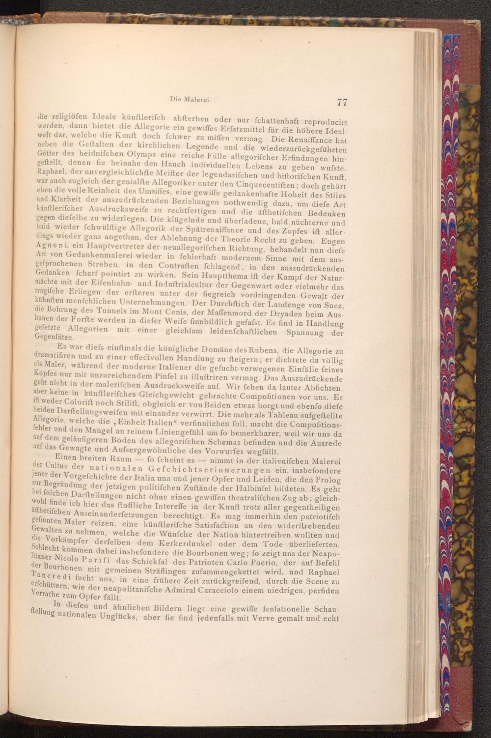 Einen breiten Raum- fo fcheint es nimmt in der italienifchen Malerei der Cultus der nationalen Gefchichtserinnerungen ein, insbesondere jener der Vorgefchichte der Italia una und jener Opfer und Leiden, die den Prolog zur Begründung der jetzigen politifchen Zuftände der Halbinsel bildeten. Es geht bei folchen Darftellungen nicht ohne einen gewiffen theatralifchen Zug ab; gleichwohl finde ich hier das ftoffliche Intereffe in der Kunft trotz aller gegentheiligen äfthetiſchen Auseinanderfetzungen berechtigt. Es mag immerhin den patriotifch gefinnten Maler reizen, eine künftlerische Satisfaction an den widerftrebenden Gewalten zu nehmen, welche die Wünsche der Nation hintertreiben wollten und die Vorkämpfer derfelben dem Kerkerdunkel oder dem Tode überlieferten. Schlecht kommen dabei insbefondere die Bourbonen weg; fo zeigt uns der Neapolitaner Nicolo Parifi das Schickfal des Patrioten Carlo Poerio, der auf Befehl der Bourbonen mit gemeinen Sträflingen zufammengekettet wird, und Raphael Tancredi fucht uns, in eine frühere Zeit zurückgreifend, durch die Scene zu erfchüttern, wie der neapolitanifche Admiral Caracciolo einem niedrigen, perfiden Verrathe zum Opfer fällt.