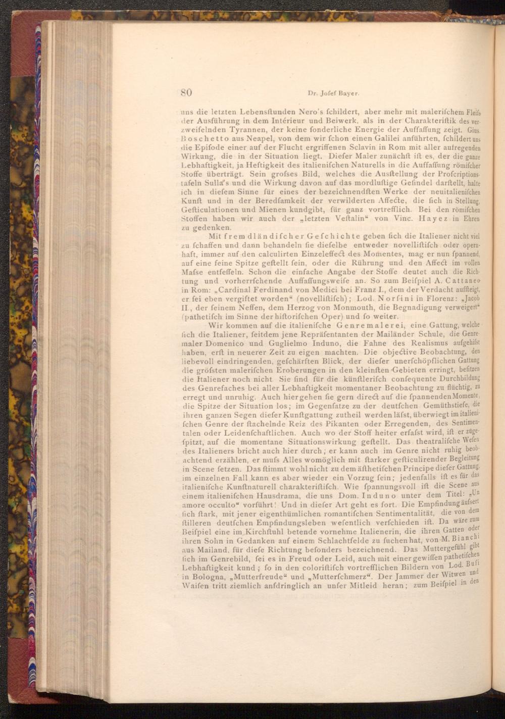 Mit frem dländifcher Gefchichte geben fich die Italiener nicht viel zu fchaffen und dann behandeln fie diefelbe entweder novelliftifch oder opernhaft, immer auf den calculirten Einzeleffect des Momentes, mag er nun fpannend, auf eine feine Spitze geftellt fein, oder die Rührung und den Affect im vollen Mafse entfeffeln. Schon die einfache Angabe der Stoffe deutet auch die Richtung und vorherrfchende Auffaffungsweife an. So zum Beiſpiel A. Cattaneo in Rom: Cardinal Ferdinand von Medici bei Franz I., dem der Verdacht auffteigt, er fei eben vergiftet worden"( novelliftifch); Lod. Norfini in Florenz:„ Jacob II., der feinem Neffen, dem Herzog von Monmouth, die Begnadigung verweigert" ( pathetiſch im Sinne der hiftorifchen Oper) und fo weiter.