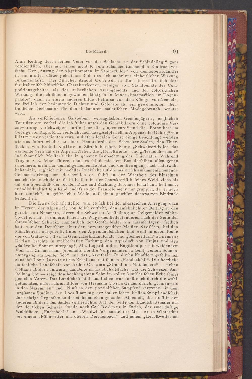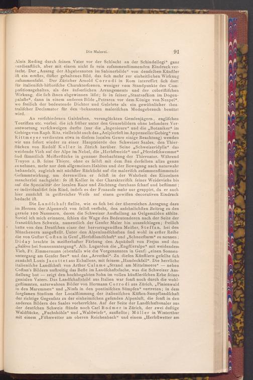 Alois Reding durch feinen Vater vor der Schlacht an der Schindellegi" ganz verdienftlich, aber mit einem nicht fo rein zufammenftimmenden Eindruck verfucht. Der, Auszug der Abgebrannten im Sabinerbilde" von demfelben Künftler ift ein ernftes, düfter gehaltenes Bild, das fich mehr zur einheitlichen Wirkung zufammenfafst. Der Züricher Arnold Corrodi in Rom intereffirt fich dort für italienifch- hiftorifche Charakterfcenen, weniger vom Standpunkte des Com pofitionsgehaltes, als des äufserlichen Arrangements und der coloriftifchen Wirkung, die fich ihnen abgewinnen läfst; fo in feiner ,, Staatsaction im Dogenpalafte", dann in einem anderen Bilde ,, Petrarca vor dem Könige von Neapel", wo freilich der bedeutende Dichter und Gelehrte als ein gewöhnlicher theatralifcher Declamator für den bekannten malerifchen Modegebrauch benützt wird.