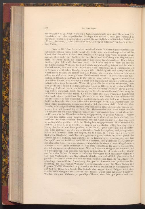 Von ruffifcher Malerei als Ausdruck einer felbftftändigen einheimifchen Schulentwicklung kann noch nicht die Rede fein, wie überhaupt nicht bei der Kunft der flavifchen Völker. Die nationale Prägung tritt wohl deutlich genug hervor, aber mehr nur ftofflich, in der Wahl und Auffaffung der Gegenstände, nicht der Form nach, als eigentlicher nationaler Kunft charakter. Ein eifriges Streben gibt fich wohl durchaus kund: die Ruffen ftehen fo recht im Stadium des künftlerifchen Wollens, das fich freilich ungleichmäfsig äufsert, und bei einem fchwankenden, hie und da ins Naive und Rohe zurückfallenden Gefchmacke oft zu feltfamen artiftifchen Kunftgebungen führt. Gelehrigkeit und Anregfamkeit in Kunftfachen theilen die Ruffen mit den Polen, obgleich die letzteren ein noch höher entwickeltes, beweglicheres Kunftnaturell haben; in der artiftifchen Emigration in München, in Paris, in Brüffel gibt es immer wieder irgend ein eminentes polnifches Talent, das die Schule ziert und zugleich mit einem eigenthümlichen individuellen Zuge heraustritt. Wenn übrigens die Polen nicht vermeiden, über ihre politifche Theilung leidenfchaftliche Klage zu führen, fo wäre eine artiftifche Theilung Rufsland nach den Schulen, wo die einzelnen Künftler etwas gelernt, eine wahre Wohlthat, felbft für die eigene Selbfterkenntnifs und Orientirung der ruffifchen Kunft über fich felbft. Es bleibt nicht aus, dafs, wenn man Kunftwerke blos nach einem politifchen Begriffe vereint wie diefs in dem ruffifchen und bei uns ebenfo in dem ungarifchen Ausftellungslocale der Fall war immer das ftoffliche Intereffe über das äfthetifche vorwiegen wird, das Dilettantifche fich dann ganz unbefangen neben das künftlerifch Gereiftere ftellt, felbft die fchulfremde, wild aufgefchoffene Malerei zwifchendurch unter diefem oder jenem Vorwande fich mit herzudrängen darf. Der Gefammteindruck wird unter folchen Umftänden nur ein beunruhigend bunter und verworrener fein, ja bei allem Vortrefflichen, das der Einzelbetrachtung entgegentritt, im grofsen Ganzen- warum foll ich den harten, aber wahren Ausdruck zurückhalten? doch ein halb barbarifches Ausfehen erhalten. Damit will ich der Anerkennung, die dem Einzelnen im vollen Mafse gebührt, nicht im Geringften entgegentreten. Was zunächft die hiftorifche Malerei betrifft, fo zeigen da die Ruffen völlig den ehrgeizigen Drang des Sturm und Drangwefens in der Kunft, ganz direct auf die bedeutenden, oder richtiger, auf die ungewöhnlichen Stoffe loszugehen, und je ungewöhn licher und feltfamer diefe fein mögen, um fo beffer. H. J. Semiradky's grofses Bild ,, Die Sünderin" nach Totstoi's gleichnamigem Gedicht ift dafür gleich das bezeichnendfte Beiſpiel. Ein Chriftus in fo fremdartiger Uebertragung aus dem Evangelifchen ins Ruffifch- Novelliftifche überfetzt, ihm gegenüber die Opernfigur der eleganten Sünderin, eine pikantere Magdalena in einem dramatifch gefpannten Moment diefs Alles zufammen ift eine harte Zumuthung für unfere Empfindung, die fich da kaum zurechtfinden kann. War es fchon ein Mifsgriff des Dichters, auf die evangelifche eine moderne Legende zu pfropfen, fo ift es ein noch grösserer von Seite des Malers, fo etwas darzuftellen. Uebrigens hat Semiradsky, wenn man von dem Verhältniffe zum Gegenftande abfieht, ein coloriftifch glänzendes Bild geliefert; es befitzt etwas von dem modern franzöfifchen Reiz, ift von effectvoller, allerdings theatralifcher Anordnung der ganzen Scenerie und gefchickten Berechnung der malerifchen Wirkung des Sonnenlichtes auf die Mauerflächen und Figuren. Waffili Werefchtagin malte ein Stück drakonifcher Kirchenjuftiz aus der Zeit der ftrengften Zucht: Ein Mönch wird wegen feiner Habgier nach dem Strafurtheile Gregor's des Grofsen mit feinem Geldbeutel lebendig begraben. Wieder ein ganz feltfames, ja grufeliges Thema, aber fehr gut gemalt und com