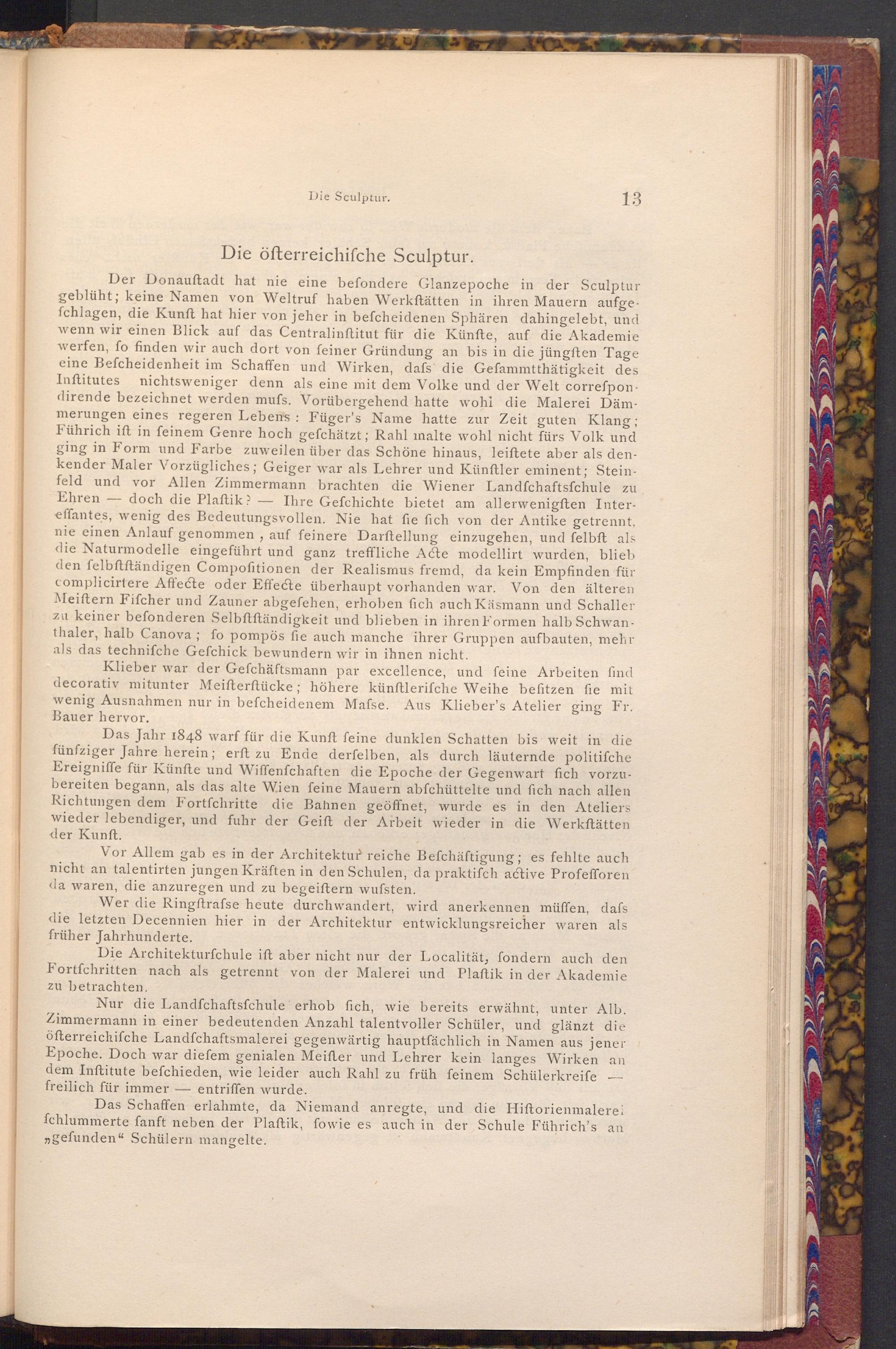 Nur die Landfchaftsfchule erhob fich, wie bereits erwähnt, unter Alb. Zimmermann in einer bedeutenden Anzahl talentvoller Schüler, und glänzt die öfterreichische Landfchaftsmalerei gegenwärtig hauptfächlich in Namen aus jener Epoche. Doch war diefem genialen Meifler und Lehrer kein langes Wirken an dem Inftitute befchieden, wie leider auch Rahl zu früh feinem Schülerkreife freilich für immer entriffen wurde.