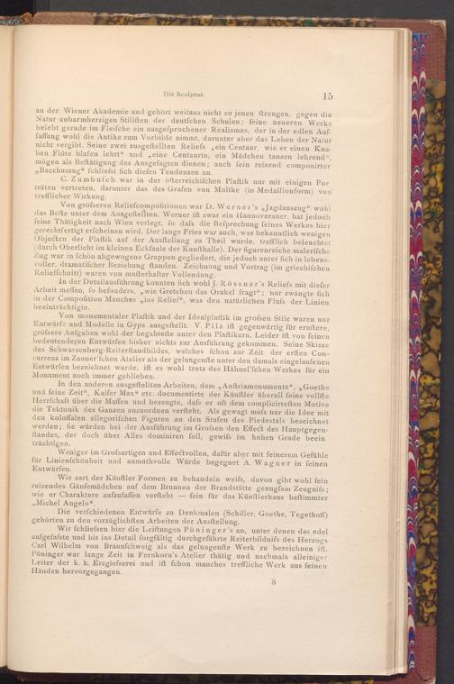 an der Wiener Akademie und gehört weitaus nicht zu jenen ftrengen, gegen die Natur unbarmherzigen Stiliften der deutfchen Schulen; feine neueren Werke belebt gerade im Fleifche ein ausgefprochener Realismus, der in der edlen Auffaffung wohl die Antike zum Vorbilde nimmt, darunter aber das Leben der Natur nicht vergibt. Seine zwei ausgeftellten Reliefs ,, ein Centaur, wie er einen Knaben Flöte blafen lehrt" und eine Centaurin, ein Mädchen tanzen lehrend", mögen als Beftätigung des Ausgefagten dienen; auch fein reizend componirter ,, Bacchuszug" fchliefst fich diefen Tendenzen an.