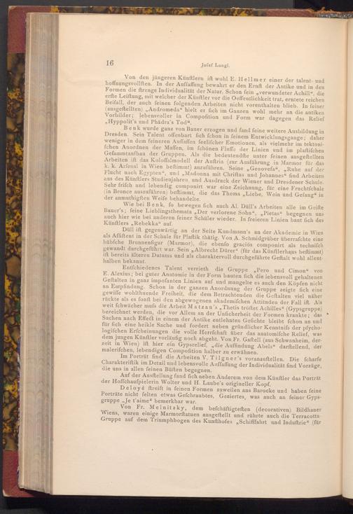 Benk wurde ganz von Bauer erzogen und fand feine weitere Ausbildung in Dresden. Sein Talent offenbart fich fchon in feinem Entwicklungsgange; daher weniger in dem feineren Auffaffen feelifcher Emotionen, als vielmehr im tektonifchen Anordnen der Maffen, im fchönen Fluffe der Linien und im plaftifchen Gefammtaufbau der Gruppen. Als die bedeutendfte unter feinen ausgeftellten Arbeiten ist das Koloffalmodell der Auftria( zur Ausführung in Marmor für das k. k. Arfenal in Wien beftimmt) anzuführen. Seine Genovefa"," Ruhe auf der Flucht nach Egypten", und„ Madonna mit Chriftus und Johannes" find Arbeiten aus des Künftlers Studienjahren, und Ausdruck der Wiener und Dresdener Schule. Sehr frifch und lebendig componirt war eine Zeichnung, für eine Fruchtfchale ( in Bronce auszuführen) beftimmt, die das Thema„ Liebe, Wein und Gefang" in der anmuthigften Weife behandelte.