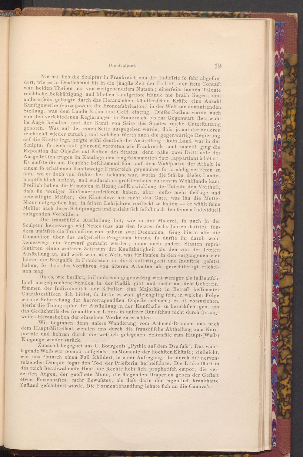 Zunächft begegnet uns C. Bourgeois' ,, Pythia auf dem Dreifufs". Das wahrfagende Weib war pompös aufgefafst, im Momente der höchften Ekftafe; vielleicht, wie uns Plutarch einen Fall fchildert, in einer Aufregung, die durch die nervenreizenden Dämpfe fogar den Tod der Priefterin herbeiführte. Die Linke fährt in das reich herabwallende Haar, die Rechte hebt fich prophetifch empor; die verzerrten Augen, der geöffnete Mund, die fliegenden Draperien geben der Geftalt etwas Furienhaftes, mehr Bewufstes, als dafs darin der eigentlich krankhafte Zuftand gefchildert würde. Die Formenbehandlung lehnte fich an die Canova's.