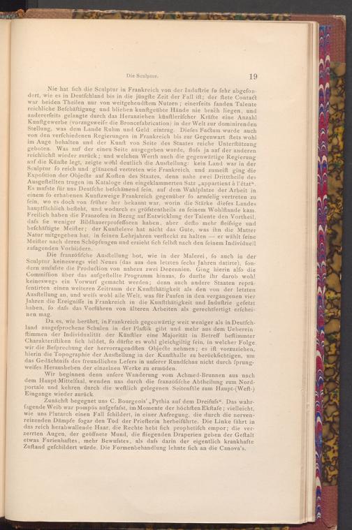 Da es, wie berührt, in Frankreich gegenwärtig weit weniger als in Deutſchland ausgefprochene Schulen in der Plaftik gibt und mehr aus dem Ueberein ftimmen der Individualität der Künftler eine Majorität in Betreff beftimmter Charakteriſtiken fich bildet, fo dürfte es wohl gleichgiltig fein, in welcher Folge wir die Befprechung der hervorragendften Objecte nehmen; es ift vorzuziehen, hierin die Topographie der Ausftellung in der Kunfthalle zu berücksichtigen, um das Gedächtnifs des freundlichen Lefers in unferer Rundfchau nicht durch fprungweifes Herausheben der einzelnen Werke zu ermüden.