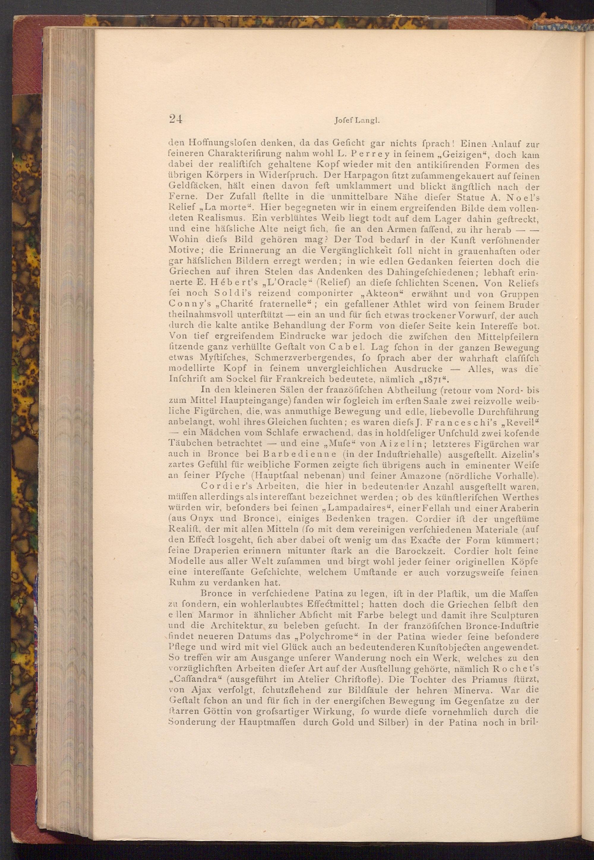In den kleineren Sälen der franzöfifchen Abtheilung( retour vom Nord- bis zum Mittel Haupteingange) fanden wir fogleich im erften Saale zwei reizvolle weibliche Figürchen, die, was anmuthige Bewegung und edle, liebevolle Durchführung anbelangt, wohl ihres Gleichen fuchten; es waren diefs J. Franceschi's ,, Revei!" - ein Mädchen vom Schlafe erwachend, das in holdfeliger Unfchuld zwei kofende Täubchen betrachtet und eine ,, Mufe" von Aizelin; letzteres Figürchen war auch in Bronce bei Barbedienne( in der Induftriehalle) ausgeftellt. Aizelin's zartes Gefühl für weibliche Formen zeigte fich übrigens auch in eminenter Weife an feiner Pfyche( Hauptfaal nebenan) und feiner Amazone( nördliche Vorhalle). Cordier's Arbeiten, die hier in bedeutender Anzahl ausgeftellt waren, müffen allerdings als intereffant bezeichnet werden; ob des künftlerifchen Werthes würden wir, befonders bei feinen„ Lampadaires", einer Fellah und einer Araberin ( aus Onyx und Bronce), einiges Bedenken tragen. Cordier ift der ungeftüme Realift, der mit allen Mitteln( fo mit dem vereinigen verfchiedenen Materiale( auf den Effect losgeht, fich aber dabei oft wenig um das Exacte der Form kümmert; feine Draperien erinnern mitunter ftark an die Barockzeit. Cordier holt feine Modelle aus aller Welt zufammen und birgt wohl jeder feiner originellen Köpfe eine intereffante Gefchichte, welchem Umftande er auch vorzugsweife feinen Ruhm zu verdanken hat.