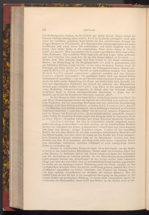 den Hoffnungslofen denken, da das Geficht gar nichts fprach! Einen Anlauf zur feineren Charakterifirung nahm wohl L. Perrey in feinem„, Geizigen", doch kam dabei der realiftifch gehaltene Kopf wieder mit den antikifirenden Formen des übrigen Körpers in Widerspruch. Der Harpagon fitzt zufammengekauert auf feinen Geldfäcken, hält einen davon feft umklammert und blickt ängftlich nach der Ferne. Der Zufall ftellte in die unmittelbare Nähe diefer Statue A. Noel's Relief ,, La morte". Hier begegneten wir in einem ergreifenden Bilde dem vollendeten Realismus. Ein verblühtes Weib liegt todt auf dem Lager dahin geftreckt, und eine häfsliche Alte neigt fich, fie an den Armen faffend, zu ihr herab Wohin diefs Bild gehören mag? Der Tod bedarf in der Kunft verföhnender Motive; die Erinnerung an die Vergänglichkeit foll nicht in grauenhaften oder gar häfslichen Bildern erregt werden; in wie edlen Gedanken feierten doch die Griechen auf ihren Stelen das Andenken des Dahingefchiedenen; lebhaft erinnerte E. Hébert's ,, L'Oracle"( Relief) an diefe fchlichten Scenen. Von Reliefs fei noch Soldi's reizend componirter„ Akteon" erwähnt und von Gruppen Conny's, Charité fraternelle"; ein gefallener Athlet wird von feinem Bruder theilnahmsvoll unterftützt ein an und für fich etwas trockener Vorwurf, der auch durch die kalte antike Behandlung der Form von diefer Seite kein Intereffe bot. Von tief ergreifendem Eindrucke war jedoch die zwifchen den Mittelpfeilern fitzende ganz verhüllte Geftalt von Cabel. Lag fchon in der ganzen Bewegung etwas Myftifches, Schmerzverbergendes, fo fprach aber der wahrhaft claffifch modellirte Kopf in feinem unvergleichlichen Ausdrucke Infchrift am Sockel für Frankreich bedeutete, nämlich„, 1871".