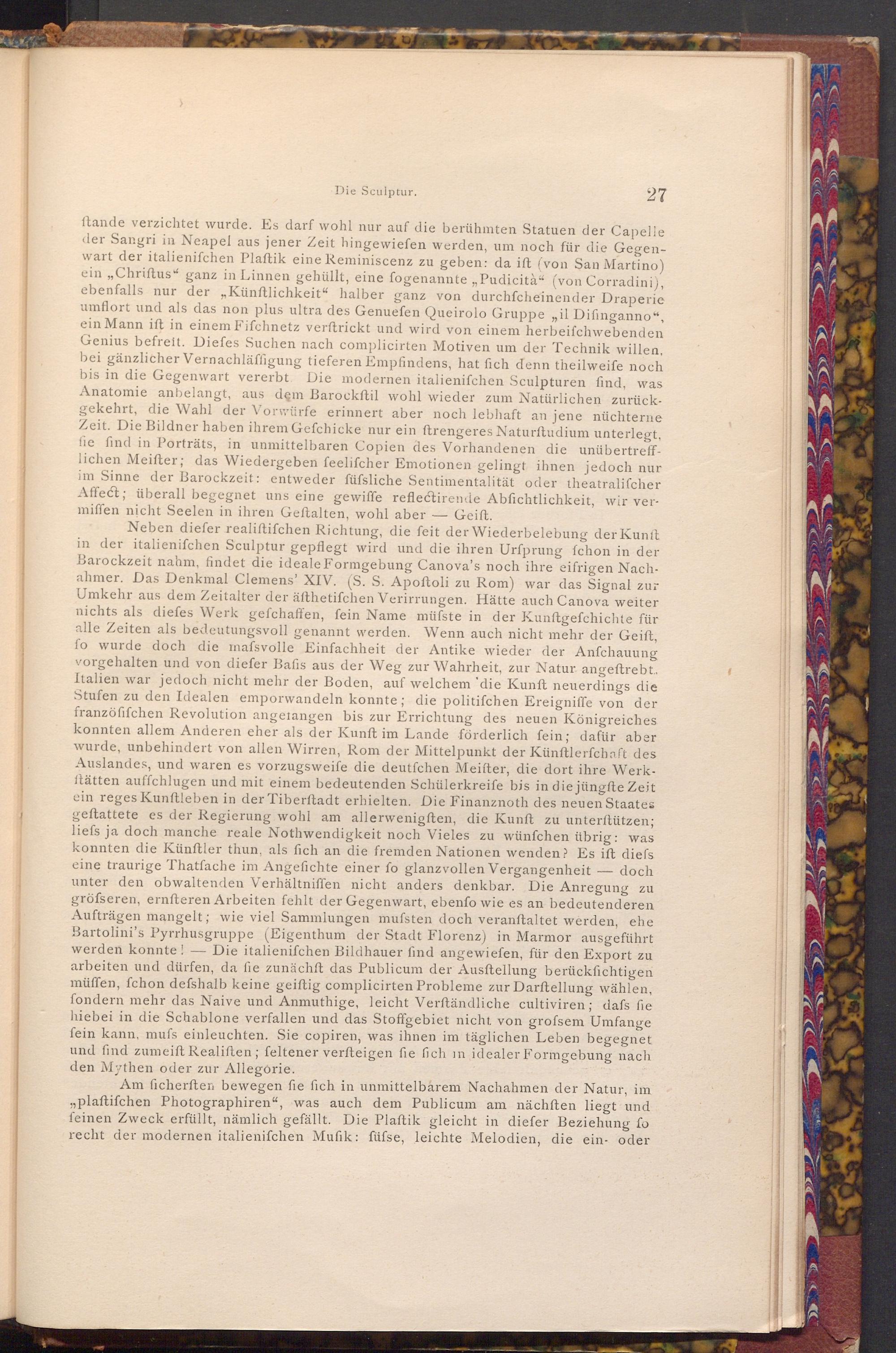 Neben diefer realiftifchen Richtung, die feit der Wiederbelebung der Kunft in der italienifchen Sculptur gepflegt wird und die ihren Urfprung fchon in der Barockzeit nahm, findet die ideale Formgebung Canova's noch ihre eifrigen Nachahmer. Das Denkmal Clemens' XIV.( S. S. Apoftoli zu Rom) war das Signal zur Umkehr aus dem Zeitalter der äfthetiſchen Verirrungen. Hätte auch Canova weiter nichts als diefes Werk gefchaffen, fein Name müfste in der Kunftgefchichte für alle Zeiten als bedeutungsvoll genannt werden. Wenn auch nicht mehr der Geift, fo wurde doch die mafsvolle Einfachheit der Antike wieder der Anfchauung vorgehalten und von diefer Bafis aus der Weg zur Wahrheit, zur Natur angeftrebt. Italien war jedoch nicht mehr der Boden, auf welchem' die Kunft neuerdings die Stufen zu den Idealen emporwandeln konnte; die politifchen Ereigniffe von der franzöfifchen Revolution angetangen bis zur Errichtung des neuen Königreiches konnten allem Anderen eher als der Kunft im Lande förderlich fein; dafür aber wurde, unbehindert von allen Wirren, Rom der Mittelpunkt der Künftlerfchaft des Auslandes, und waren es vorzugsweife die deutfchen Meifter, die dort ihre Werkftätten auffchlugen und mit einem bedeutenden Schülerkreife bis in die jüngfte Zeit ein reges Kunftleben in der Tiberftadt erhielten. Die Finanznoth des neuen Staates geftattete es der Regierung wohl am allerwenigften, die Kunft zu unterſtützen; liefs ja doch manche reale Nothwendigkeit noch Vieles zu wünſchen übrig: was konnten die Künftler thun, als fich an die fremden Nationen wenden? Es ift diefs eine traurige Thatfache im Angefichte einer fo glanzvollen Vergangenheit- doch unter den obwaltenden Verhältniffen nicht anders denkbar. Die Anregung zu gröfseren, ernfteren Arbeiten fehlt der Gegenwart, ebenfo wie es an bedeutenderen Aufträgen mangelt; wie viel Sammlungen mufsten doch veranftaltet werden, ehe Bartolini's Pyrrhusgruppe( Eigenthum der Stadt Florenz) in Marmor ausgeführt werden konnte! Die italienifchen Bildhauer find angewiefen, für den Export zu arbeiten und dürfen, da fie zunächft das Publicum der Ausftellung berücksichtigen müffen, fchon defshalb keine geiftig complicirten Probleme zur Darstellung wählen, fondern mehr das Naive und Anmuthige, leicht Verſtändliche cultiviren; dafs fie hiebei in die Schablone verfallen und das Stoffgebiet nicht von grofsem Umfange fein kann, mufs einleuchten. Sie copiren, was ihnen im täglichen Leben begegnet und find zumeift Realiften; feltener verfteigen fie fich in idealer Formgebung nach den Mythen oder zur Allegórie.