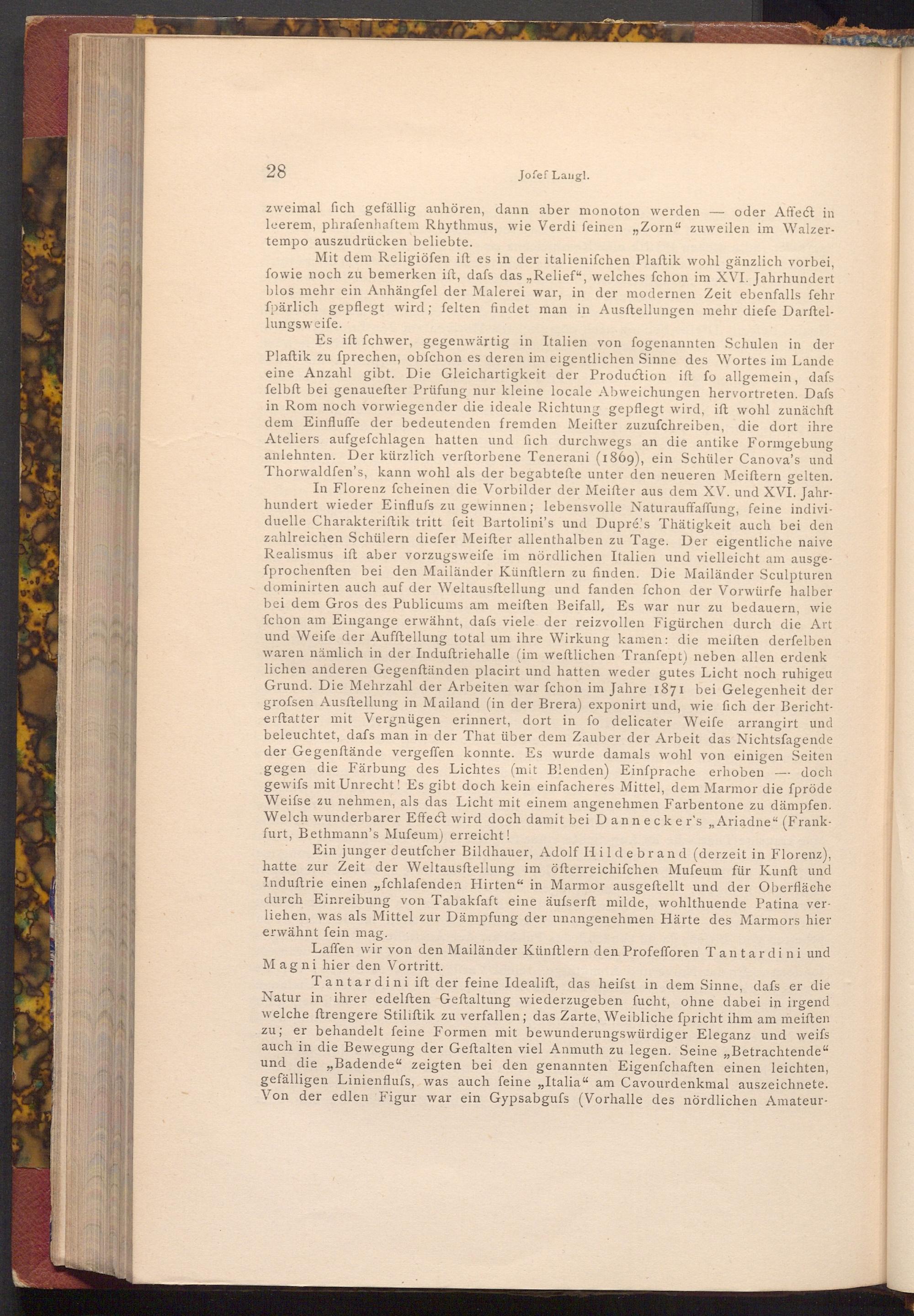 Ein junger deutfcher Bildhauer, Adolf Hildebrand( derzeit in Florenz), hatte zur Zeit der Weltausftellung im öfterreichifchen Muſeum für Kunft und Induſtrie einen„ fchlafenden Hirten" in Marmor ausgeftellt und der Oberfläche durch Einreibung von Tabakfaft eine äufserft milde, wohlthuende Patina verliehen, was als Mittel zur Dämpfung der unangenehmen Härte des Marmors hier erwähnt fein mag.