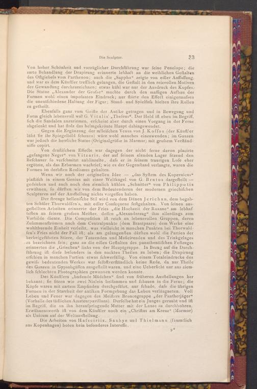 Von hoher Schönheit und vorzüglicher Durchführung war feine Penelope; die zarte Behandlung der Drapirung erinnerte lebhaft an die weiblichen Geftalten des Oftgiebels vom Parthenon; auch die„ Sappho" zeigte von edler Auffaffung, und war es dem Künftler trefflich gelungen, die Geftalt in den reizvollen Motiven der Gewandung durchzuzeichnen; etwas kühl war nur der Ausdruck des Kopfes. Die Statue Alexander der Grofse" machte durch den maffigen Aufbau der Formen wohl einen impofanten Eindruck; nur ftörte den Effect einigermafsen die unentfchiedene Haltung der Figur; Stand- und Spielfufs hielten ihre Rollen zu getheilt.