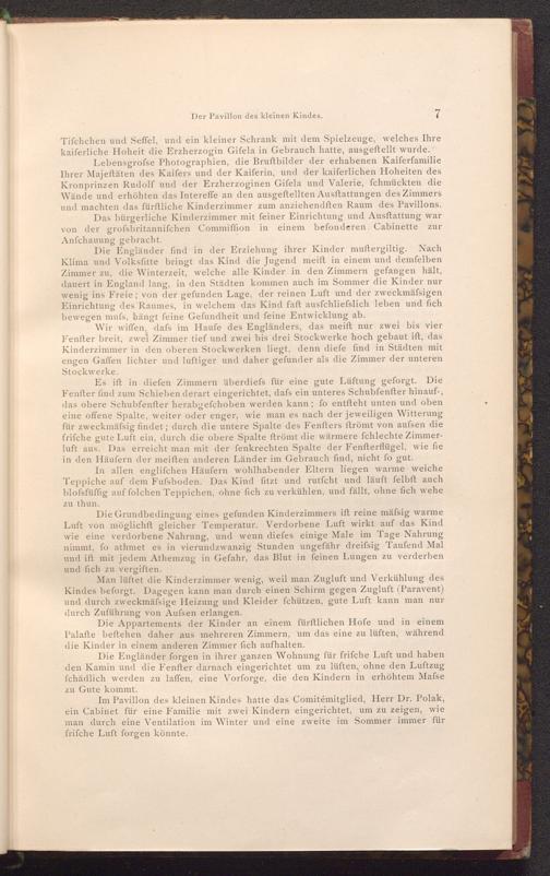 Lebensgrofse Photographien, die Bruftbilder der erhabenen Kaiferfamilie Ihrer Majeftäten des Kaifers und der Kaiferin, und der kaiferlichen Hoheiten des Kronprinzen Rudolf und der Erzherzoginen Gifela und Valerie, fchmückten die Wände und erhöhten das Intereffe an den ausgeftellten Ausftattungen des Zimmers und machten das fürftliche Kinderzimmer zum anziehendften Raum des Pavillons. Das bürgerliche Kinderzimmer mit feiner Einrichtung und Ausftattung war von der grofsbritannifchen Commiffion in einem befonderen Cabinette Anfchauung gebracht.