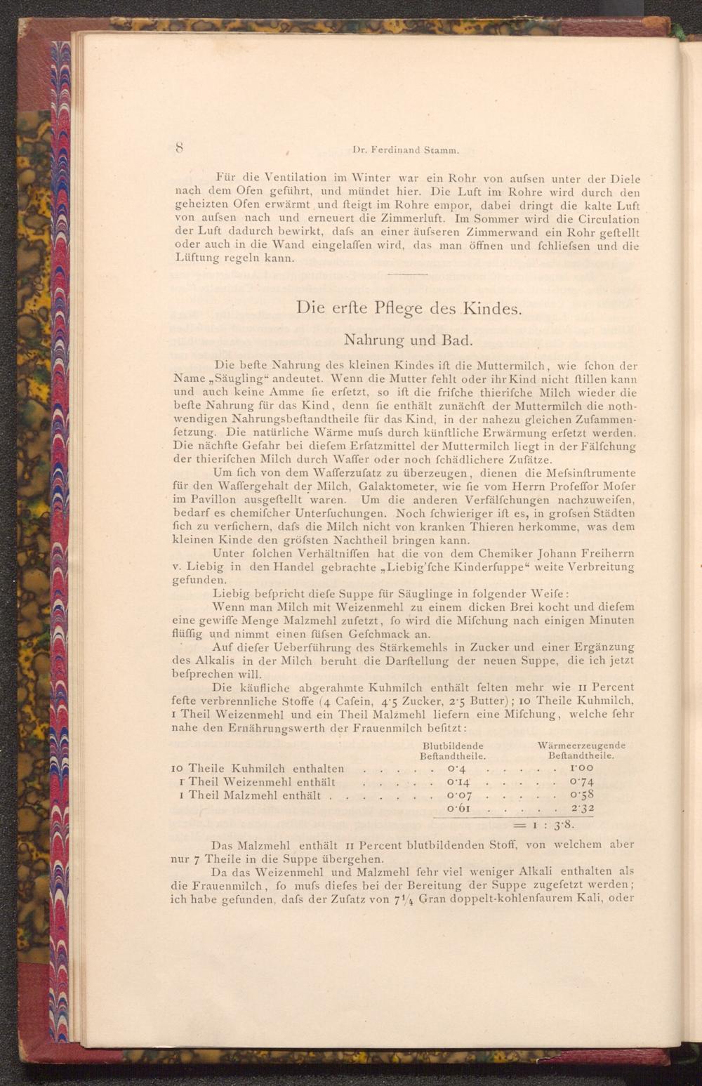 Die käufliche abgerahmte Kuhmilch enthält felten mehr wie II Percent fefte verbrennliche Stoffe( 4 Cafein, 45 Zucker, 2.5 Butter); 10 Theile Kuhmilch, I Theil Weizenmehl und ein Theil Malzmehl liefern eine Mifchung, welche fehr nahe den Ernährungswerth der Frauenmilch befitzt:
