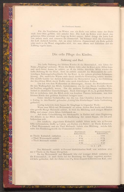 Die befte Nahrung des kleinen Kindes ift die Muttermilch, wie fchon der Name ,, Säugling" andeutet. Wenn die Mutter fehlt oder ihr Kind nicht ftillen kann und auch keine Amme fie erfetzt, so ift die frifche thierifche Milch wieder die befte Nahrung für das Kind, denn fie enthält zunächft der Muttermilch die nothwendigen Nahrungsbeftandtheile für das Kind, in der nahezu gleichen Zufammenfetzung. Die natürliche Wärme mufs durch künftliche Erwärmung erfetzt werden. Die nächfte Gefahr bei diefem Erfatzmittel der Muttermilch liegt in der Fälfchung der thierifchen Milch durch Waffer oder noch fchädlichere Zufätze.