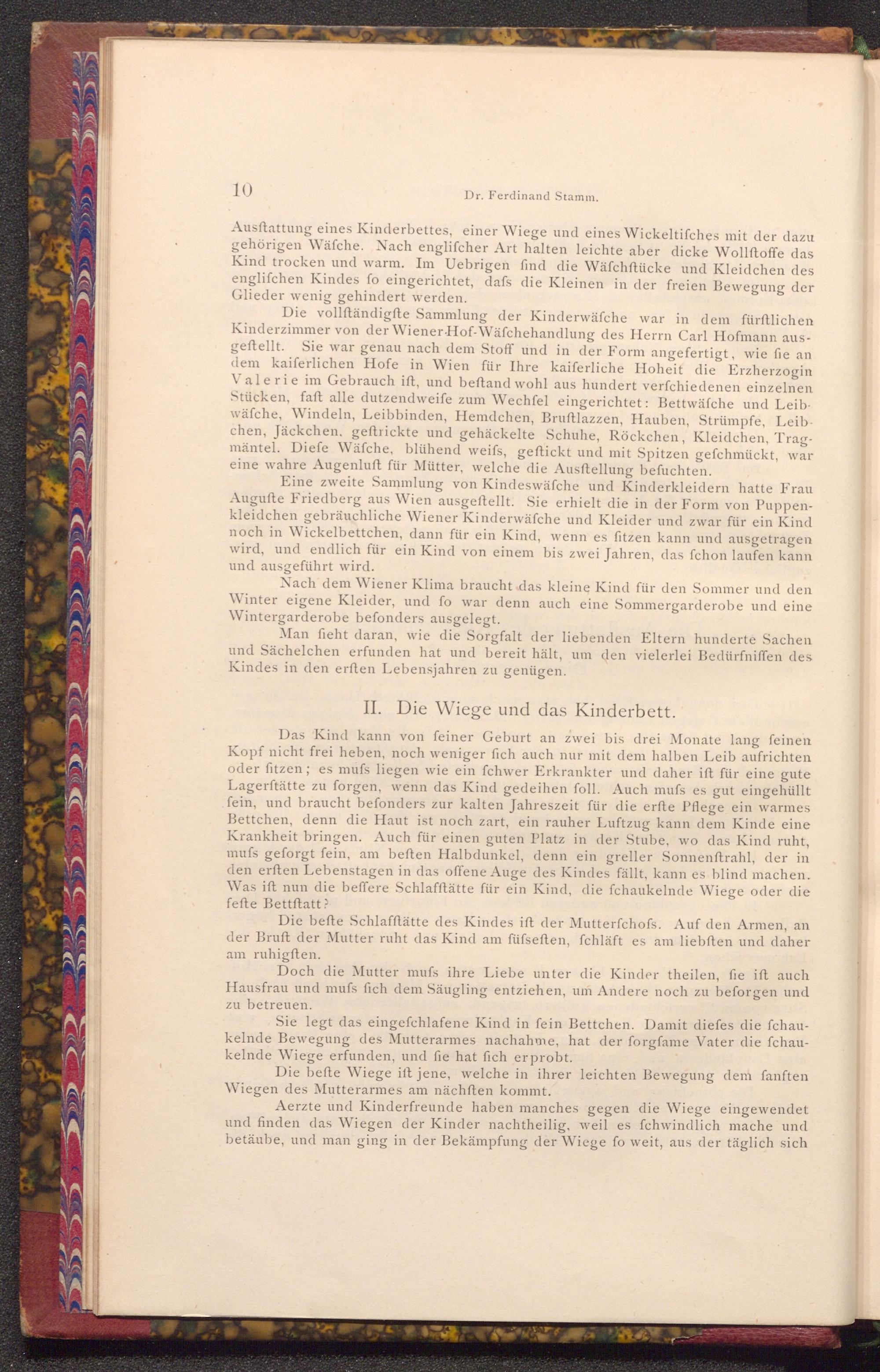 Eine zweite Sammlung von Kindeswäfche und Kinderkleidern hatte Frau Augufte Friedberg aus Wien ausgeftellt. Sie erhielt die in der Form von Puppenkleidchen gebräuchliche Wiener Kinderwäfche und Kleider und zwar für ein Kind noch in Wickelbettchen, dann für ein Kind, wenn es fitzen kann und ausgetragen wird, und endlich für ein Kind von einem bis zwei Jahren, das fchon laufen kann und ausgeführt wird.