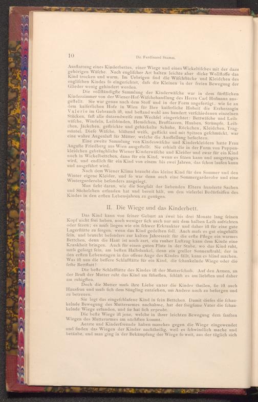 Das Kind kann von feiner Geburt an zwei bis drei Monate lang feinen Kopf nicht frei heben, noch weniger fich auch nur mit dem halben Leib aufrichten oder fitzen; es mufs liegen wie ein fchwer Erkrankter und daher ift für eine gute Lagerftätte zu forgen, wenn das Kind gedeihen foll. Auch mufs es gut eingehüllt fein, und braucht befonders zur kalten Jahreszeit für die erfte Pflege ein warmes Bettchen, denn die Haut ist noch zart, ein rauher Luftzug kann dem Kinde eine Krankheit bringen. Auch für einen guten Platz in der Stube, wo das Kind ruht, mufs geforgt fein, am beften Halbdunkel, denn ein greller Sonnenftrahl, der in den erften Lebenstagen in das offene Auge des Kindes fällt, kann es blind machen. Was ift nun die beffere Schlafftätte für ein Kind, die fchaukelnde Wiege oder die fefte Bettftatt?