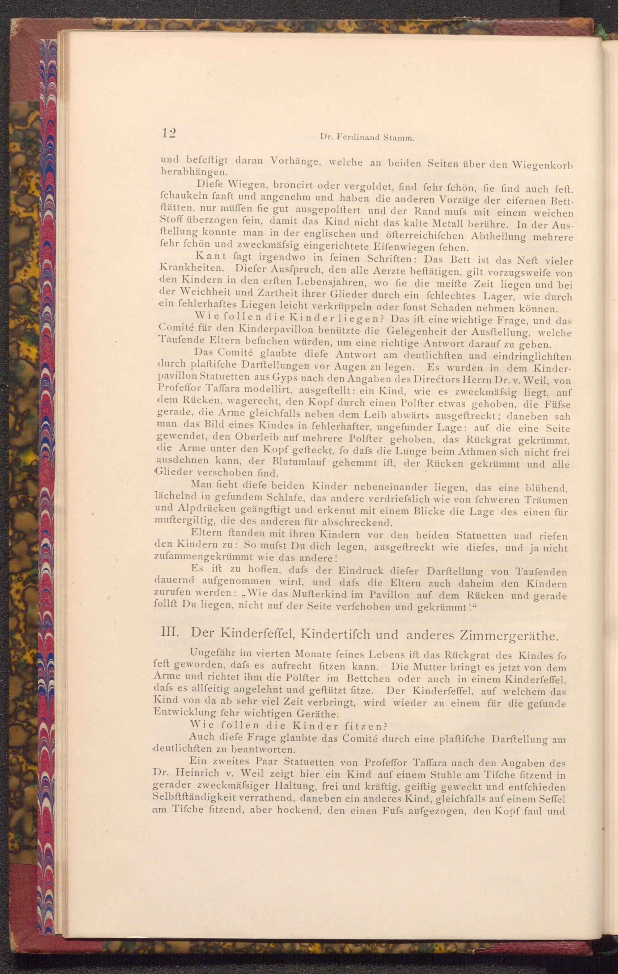 Das Comité glaubte diefe Antwort am deutlichften und eindringlichften durch plaftifche Darftellungen vor Augen zu legen. Es wurden in dem Kinderpavillon Statuetten aus Gyps nach den Angaben des Directors Herrn Dr. v. Weil, von Profeffor Taffara modellirt, ausgeftellt: ein Kind, wie es zweckmäfsig liegt, auf dem Rücken, wagerecht, den Kopf durch einen Polfter etwas gehoben, die Füfse gerade, die Arme gleichfalls neben dem Leib abwärts ausgeftreckt; daneben sah man das Bild eines Kindes in fehlerhafter, ungefunder Lage: auf die eine Seite gewendet, den Oberleib auf mehrere Polfter gehoben, das Rückgrat gekrümmt, die Arme unter den Kopf gefteckt, fo dafs die Lunge beim Athmen sich nicht frei ausdehnen kann, der Blutumlauf gehemmt ift, der Rücken gekrümmt und alle Glieder verschoben find.