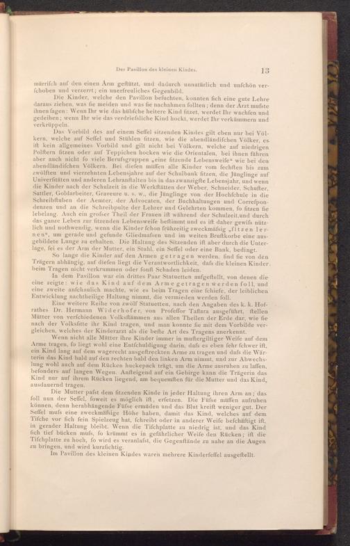 Eine weitere Reihe von zwölf Statuetten, nach den Angaben des k. k. Hofrathes Dr. Hermann Widerhofer, von Profeffor Taffara ausgeführt, ftellen Mütter von verfchiedenen Volksftämmen aus allen Theilen der Erde dar, wie fie nach der Volksfitte ihr Kind tragen, und man konnte fie mit dem Vorbilde vergleichen, welches der Kinderarzt als die befte Art des Tragens anerkennt.