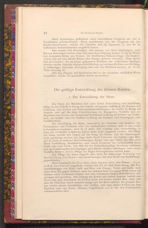Die Ausbildung der Sinne, namentlich des Gefichtes und Gehöres, des Farbenfinnes und Tonfinnes oder des mufikalifchen Gehöres mufs in den ersten Lebensjahren beginnen; wird fie in diefer Zeit verfäumt oder vernachläffigt, fo kann das Verfäumte in fpäteren Jahren nicht mehr eingeholt werden. Die Pflege der Sinne bezieht fich einmal auf die Sorge der Eltern, dafs die Sinnesorgane nicht gefchädigt werden, das Auge nicht durch Ueberreiz des Lichtes oder Mangel an Licht in finfteren Stadtwohnungen ftumpf oder gar blind, das Ohr nicht durch Verkühlung, Krankheiten oder durch Ueberreiz bei bedeutendem Lärm krank oder taub werde. Das fällt mit der Gefundheitspflege überhaupt zufammen und das Comité mufste fich begnügen, gute Bücher darüber aufzulegen, unter denen Profeffor Ritter v. Arlts Pflege des Auges hervorgehoben werden kann.