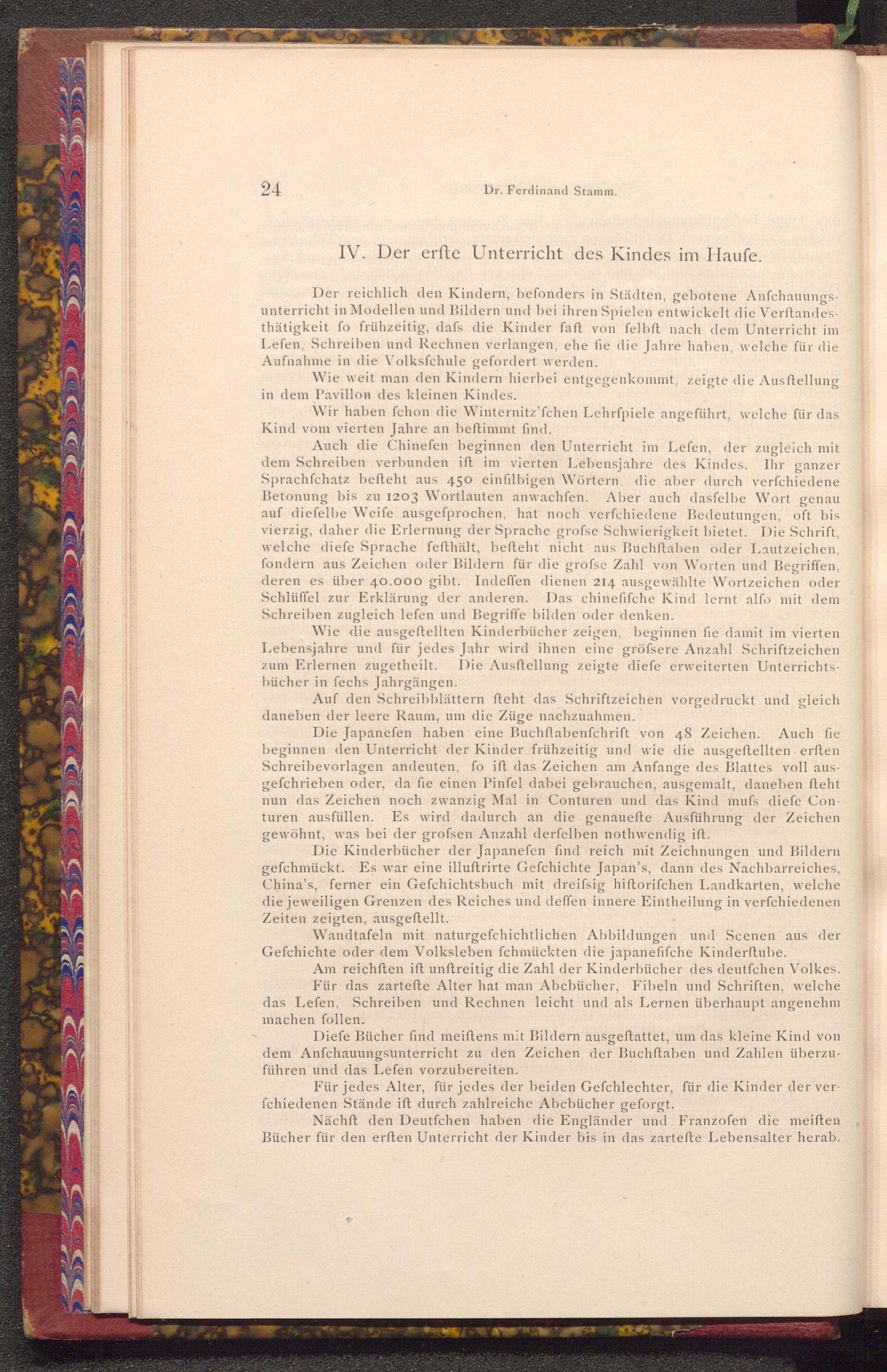 Auch die Chinefen beginnen den Unterricht im Lefen, der zugleich mit dem Schreiben verbunden ist im vierten Lebensjahre des Kindes. Ihr ganzer Sprachfchatz befteht aus 450 einfilbigen Wörtern. die aber durch verfchiedene Betonung bis zu 1203 Wortlauten anwachfen. Aber auch dasfelbe Wort genau auf diefelbe Weife ausgefprochen, hat noch verfchiedene Bedeutungen, oft bis vierzig, daher die Erlernung der Sprache grofse Schwierigkeit bietet. Die Schrift, welche diefe Sprache fefthält, befteht nicht aus Buchftaben oder Lautzeichen, fondern aus Zeichen oder Bildern für die grofse Zahl von Worten und Begriffen, deren es über 40.000 gibt. Indeffen dienen 214 ausgewählte Wortzeichen oder Schlüffel zur Erklärung der anderen. Das chinefifche Kind lernt alfo mit dem Schreiben zugleich lefen und Begriffe bilden oder denken.