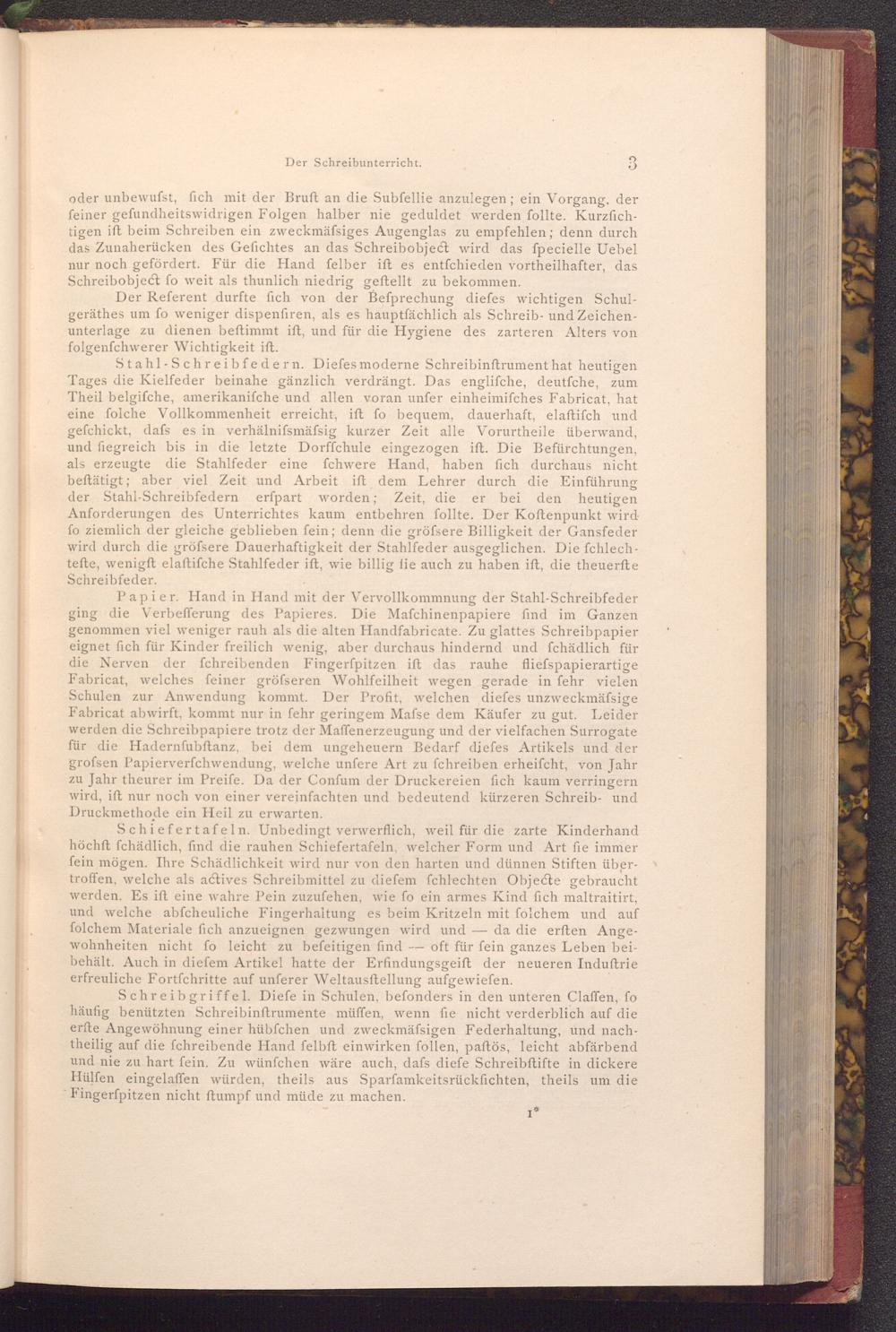 Schiefertafeln. Unbedingt verwerflich, weil für die zarte Kinderhand höchft fchädlich, find die rauhen Schiefertafeln, welcher Form und Art fie immer fein mögen. Ihre Schädlichkeit wird nur von den harten und dünnen Stiften übertroffen, welche als actives Schreibmittel zu diefem fchlechten Objecte gebraucht werden. Es ift eine wahre Pein zuzufehen, wie fo ein armes Kind fich maltraitirt, und welche abfcheuliche Fingerhaltung es beim Kritzeln mit folchem und auf folchem Materiale fich anzueignen gezwungen wird und da die erften Angewohnheiten nicht fo leicht zu befeitigen find-- oft für fein ganzes Leben beibehält. Auch in diefem Artikel hatte der Erfindungsgeift der neueren Induftrie erfreuliche Fortfchritte auf unferer Weltausftellung aufgewiefen.