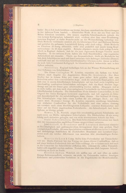 Jofef Gilloff, G. Brandauer und D. Leonhard überboten einander an Reichhaltigkeit und gefchmackvollem Arrangement ihrer zum grofsen Theil vorzüglichen Producte. Als neue Specialitäten erwähnen wir Brandauer's doppelund mehrfpitzige Stahlfedern für Zierfchriften. Brandauer und Leonhard exponirten noch ein reiches Affortiment von manchen fehr zweckmäfsigen Federhaltern.