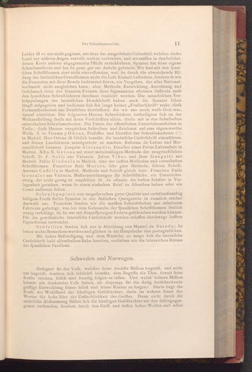 Leider ift es uns nicht gegönnt, uns über das ausgedehnte Culturfeld, welches diefes Land vor unferen Augen entrollt, weit zu verbreiten, und wir müffen in den befcheidenen Kreis unferer abgegrenzten Pflicht zurückkehren. Spanien hat feine eigene Schreibmethode und hat fie ganz gut zur Anficht gebracht. Wir find mit den fpanifchen Schriftformen aber nicht einverftanden, weil fie durch die abweichende Bildung der lateinifchen Grundformen nicht die Lefe- Einheit befördern, fondern fo wie die Franzofen mit ihrer Ronde bedeutend ftören, ein Vergehen, das aller Nationalhochmuth nicht ausgleichen kann; aber Methode, Entwicklung, Anordnung und Gefchmack trotz der bizzaren Formen ihrer fogenannten efcritura iluftrada mufs den fpanifchen Schreiblehrern durchaus vindicirt werden. Die mönchifchen Verkrüppelungen der lateinifchen Druckfchrift haben auch die Spanier fchon längft aufgegeben und bedienen fich feit lange keiner„ Fracturfchrift" mehr, diefe Formenthorheiten uns Deutfchen überlaffend, die wir uns noch, weifs Gott was, darauf einbilden. Die folgenden Herren Schreiblehrer betheiligten fich an der Weltausftellung theils mit ihren Vorfchriften allein, theils mit in den Schulheften entwickelten Schreibmethoden: Die Patres der öffentlichen Unterrichtsanftalten in Yecta; diefe Herren verquicken Schreiben und Zeichnen auf eine rügenswerthe Weife. S. de Vicente y Odone, Profeffor und Director der Schreibakademie(?!) in Madrid. Herr Odone ift löblich bemüht, die lateinifche Curfivfchrift einzuführen, und feinen Landsleuten mundgerecht zu machen, Reforma de Letras und Mercantilfchrift benannt. Joaquim Aleixandre, Director einer Privat- Lehranftalt in Madrid. Xifra N. Gerona mit einer mittelmässigen Methode der neugriechifchen Schrift. D. P. Solís aus Valencia. Julian Viñas und Juan Gangoiti aus Madrid. Pablo Uruñuela in Madrid, eine der beften Methoden und correcteften Schriftformen. Francisco Ruiz Morota, fehr gute Methode, fchöne Schrift. Antonio Caftilla in Madrid, Methode und Schrift gleich brav. Francisco Paula Gonzales aus Valencia, Mufteranordnungen für Schriftftücke, ein Unterrichtszweig, der nicht genug zu empfehlen ift, da oftmals die beften Schüler in Verlegenheit gerathen, wenn fie einen einfachen Brief zu fchreiben haben oder ein Conto auffetzen follen.