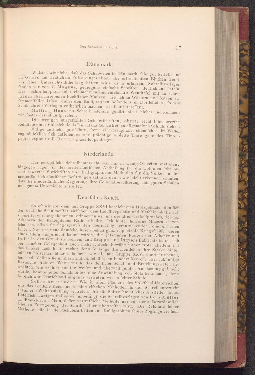 Der europäiſche Schreibunterricht war nur in wenig Objecten vertreten; hingegen lagen in der niederländifchen Abtheilung für die Colonien fehr beachtenswerthe Vorfchriften und kalligraphifche Methoden für die Völker in den niederländifch- afiatifchen Befitzungen auf, aus denen wir leicht erkennen konnten, dafs die niederländifche Regierung ihre Colonialbevölkerung mit guten Schulen und gutem Unterrichte ausrüftet.
