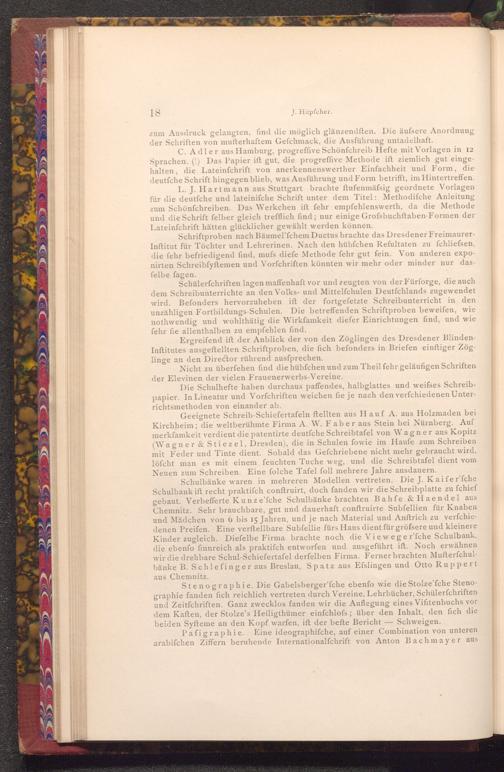 C. Adler aus Hamburg, progreffive Schönfchreib Hefte mit Vorlagen in 12 Sprachen.(!) Das Papier ift gut, die progreffive Methode ift ziemlich gut eingehalten, die Lateinfchrift von anerkennenswerther Einfachheit und Form, die deutfche Schrift hingegen blieb, was Ausführung und Form betrifft, im Hintertreffen. L. J. Hartmann aus Stuttgart brachte ftufenmäfsig geordnete Vorlagen für die deutfche und lateinifche Schrift unter dem Titel: Methodifche Anleitung zum Schönfchreiben. Das Werkchen ift fehr empfehlenswerth, da die Methode und die Schrift felber gleich trefflich find; nur einige Grofsbuchftaben Formen der Lateinfchrift hätten glücklicher gewählt werden können.
