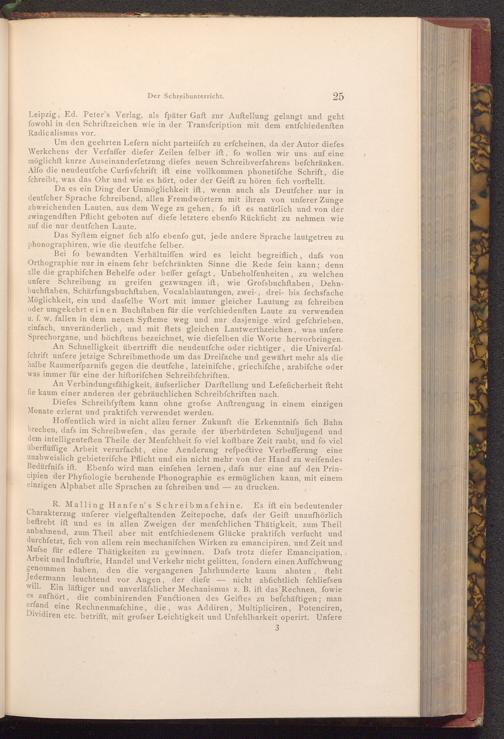 Hoffentlich wird in nicht allzu ferner Zukunft die Erkenntnifs fich Bahn brechen, dafs im Schreibwefen, das gerade der überbürdeten Schuljugend und dem intelligenteften Theile der Menfchheit fo viel koftbare Zeit raubt, und fo viel überflüffige Arbeit verurfacht, eine Aenderung refpective Verbefferung eine unabweislich gebieterifche Pflicht und ein nicht mehr von der Hand zu weifendes Bedürfnifs ift. Ebenfo wird man einfehen lernen, dafs nur eine auf den Principien der Phyfiologie beruhende Phonographie es ermöglichen kann, mit einem einzigen Alphabet alle Sprachen zu fchreiben und zu drucken.