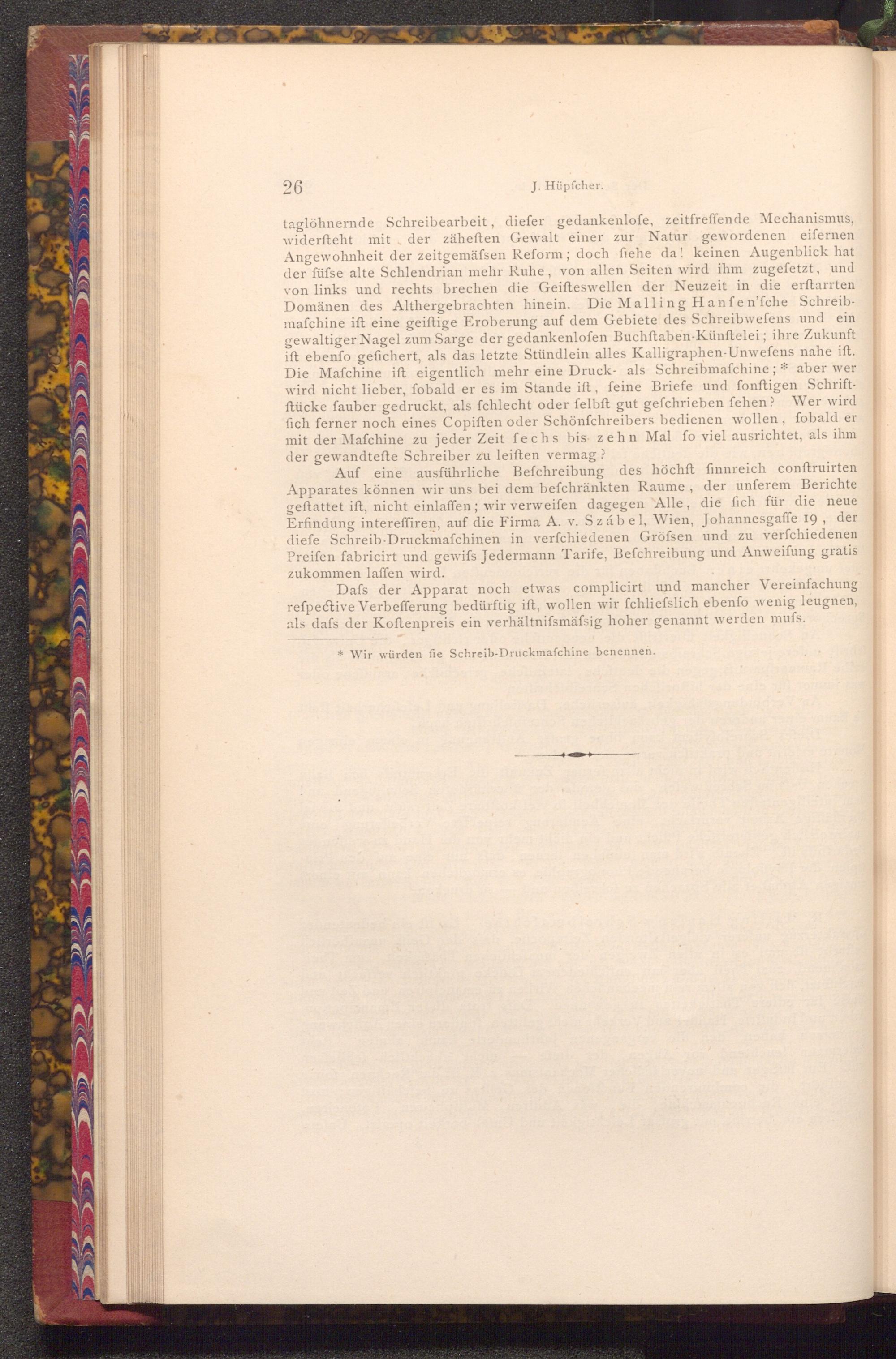 Auf eine ausführliche Befchreibung des höchft finnreich conftruirten Apparates können wir uns bei dem befchränkten Raume, der unferem Berichte geftattet ift, nicht einlaffen; wir verweifen dagegen Alle, die fich für die neue Erfindung intereffiren, auf die Firma A. v. Szábel, Wien, Johannesgaffe 19, der diefe Schreib- Druckmafchinen in verfchiedenen Gröfsen und zu verfchiedenen Preifen fabricirt und gewifs Jedermann Tarife, Befchreibung und Anweifung gratis zukommen laffen wird.