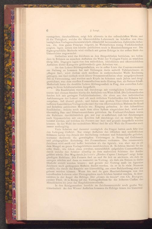 Viele Schulen und darunter vorzüglich die Prager hatten auch fehr klar den Lehrgang illuftrirt. Nur einige Anftalten des öftlichen und nordöftlichen Böhmens hatten den Zweck der Ausftellung verkannt und Schauobjecte geliefert, worunter theilweife die gewaltigften Verirrungen in Bezug auf Gefchmack und pädagogifche Erziehung des Formenfinnes vorkamen. Das ornamentale Zeichnen wird meift viel beffer betrieben als das figurale, was aber nur zu oft dem Mangel an guten Vorlageblättern zuzufchreiben ift. Es fehlen überall für die erfte Stufe, wie fchon oben erwähnt, naturaliftifch aufgefafste Contourftudien, durch welche der Schüler allmälig zu dem mafsvollen Schönen der Antike geführt würde. Der Weg durch Julien's ,, Etudes d'apres l'Antique" zeigt keine günftigen Refultate. Die Formen find an und für fich zu nüchtern, als dafs fie anregen würden und dann zu manierirt im Vortrag, als dafs ein Nutzen in diefer Hinficht erzielt werden könnte; und gerade der Vortrag mufs im figuralen Zeichnen nach gediegenen Muftern ftudirt werden, da er in fo viele Nuancen zerfällt, die durch die Empirie nur fchwerfällig, aus einer Befchreibung aber nie gelernt werden können. Wenn hie und da gute Handzeichnungen von den betreffenden Lehrern oder Photographien nach folchen benützt wurden, fo überrafchten in der Regel die Erfolge. Der„ Cours de dessin" von Ch. Bargue, zweiter Theil, ift in Bezug auf das Vortragsftudium für die höheren Claffen der Mittelfchulen bis jetzt das Empfehlenswerthefte.