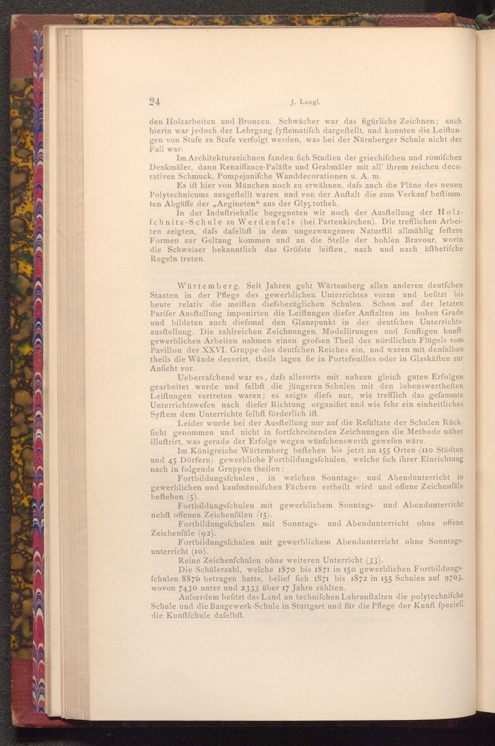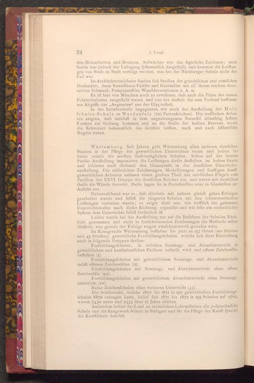 Würtemberg. Seit Jahren geht Würtemberg allen anderen deutfchen Staaten in der Pflege des gewerblichen Unterrichtes voran und befitzt bis heute relativ die meiſten diefsbezüglichen Schulen. Schon auf der letzten Parifer Ausftellung imponirten die Leiftungen diefer Anftalten im hohen Grade und bildeten auch diefsmal den Glanzpunkt in der deutfchen Unterrichtsausftellung. Die zahlreichen Zeichnungen, Modellirungen und fonftigen kunftgewerblichen Arbeiten nahmen einen grofsen Theil des nördlichen Flügels vom Pavillon der XXVI. Gruppe des deutfchen Reiches ein, und waren mit denfelben theils die Wände decorirt, theils lagen fie in Portefeuilles oder in Glaskäften zur Anficht vor.