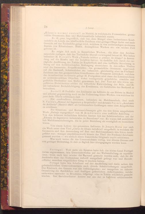 Von einem Lehrer des genannten Inftitutes D. Joaquin Mata war auch ein Werk unter dem Titel„, Curso de dibujo induftrial" ausgeftellt, in welchem die Geometrie und ihre Anwendung auf Bau- und Maſchinenkunde fehr fchön durchgeführt war; weniger empfehlenswerth könnte der Theil des Freihand Zeichnens genannt werden wo einfach ältere franzöfifche Originale copirt erfchienen.