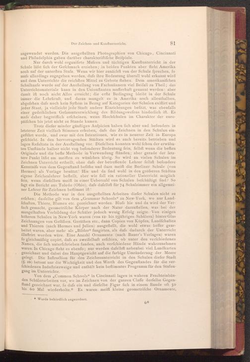 Von dem ,, Common Schools" in Cincinnati lagen in wahren Prachteinbänden Schülerarbeiten vor, wo im Zeichnen von der ganzen Claffe derfelbe Gegenftand gezeichnet war, fo dafs ein und diefelbe Figur fich in einem Bande oft 50 bis 60 Mal wiederholte.* Es waren meitt kleine geometriſche Ornamente,