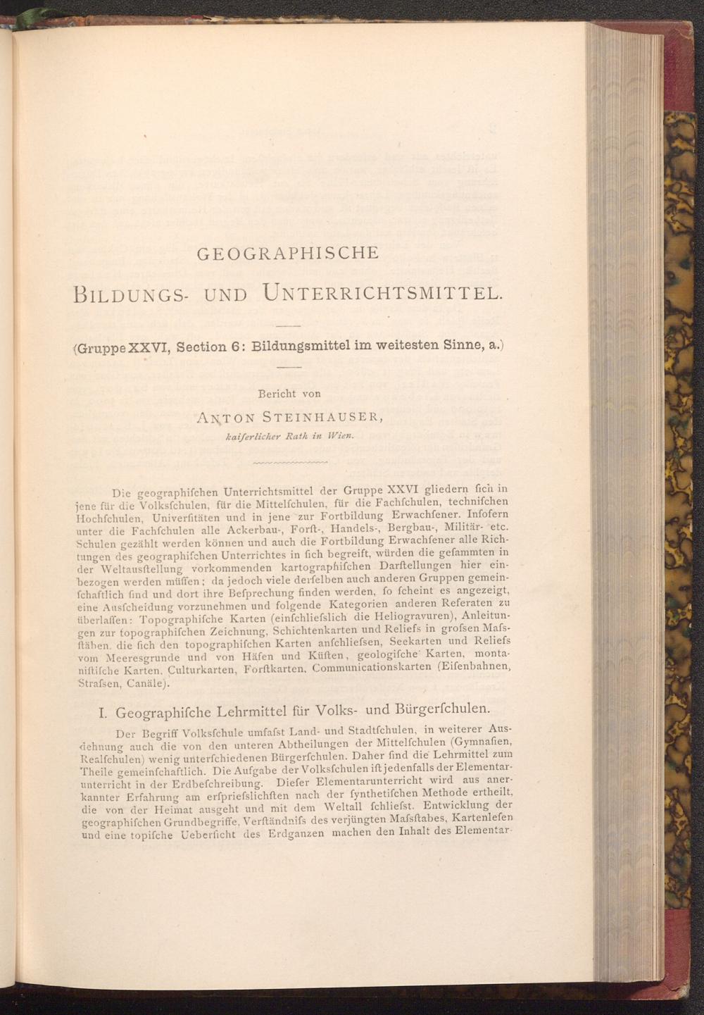 Die geographifchen Unterrichtsmittel der Gruppe XXVI gliedern fich in jene für die Volksfchulen, für die Mittelfchulen, für die Fachſchulen, technifchen Hochfchulen, Univerfitäten und in jene zur Fortbildung Erwachſener. Infofern unter die Fachfchulen alle Ackerbau-, Forft-, Handels-, Bergbau-, Militär- etc. Schulen gezählt werden können und auch die Fortbildung Erwachfener alle Richtungen des geographifchen Unterrichtes in fich begreift, würden die gefammten in der Weltausftellung vorkommenden kartographifchen Darftellungen hier einbezogen werden müffen; da jedoch viele derfelben auch anderen Gruppen gemeinfchaftlich find und dort ihre Befprechung finden werden, fo fcheint es angezeigt, eine Ausfcheidung vorzunehmen und folgende Kategorien anderen Referaten zu überlaffen: Topographifche Karten( einfchliefslich die Heliogravuren), Anleitungen zur topographifchen Zeichnung, Schichtenkarten und Reliefs in grofsen Mafsftäben. die fich den topographifchen Karten anfchliefsen, Seekarten und Reliefs vom Meeresgrunde und von Häfen und Küften, geologifche Karten, montaniftifche Karten, Culturkarten, Forftkarten, Communicationskarten( Eifenbahnen, Strafsen, Canäle).