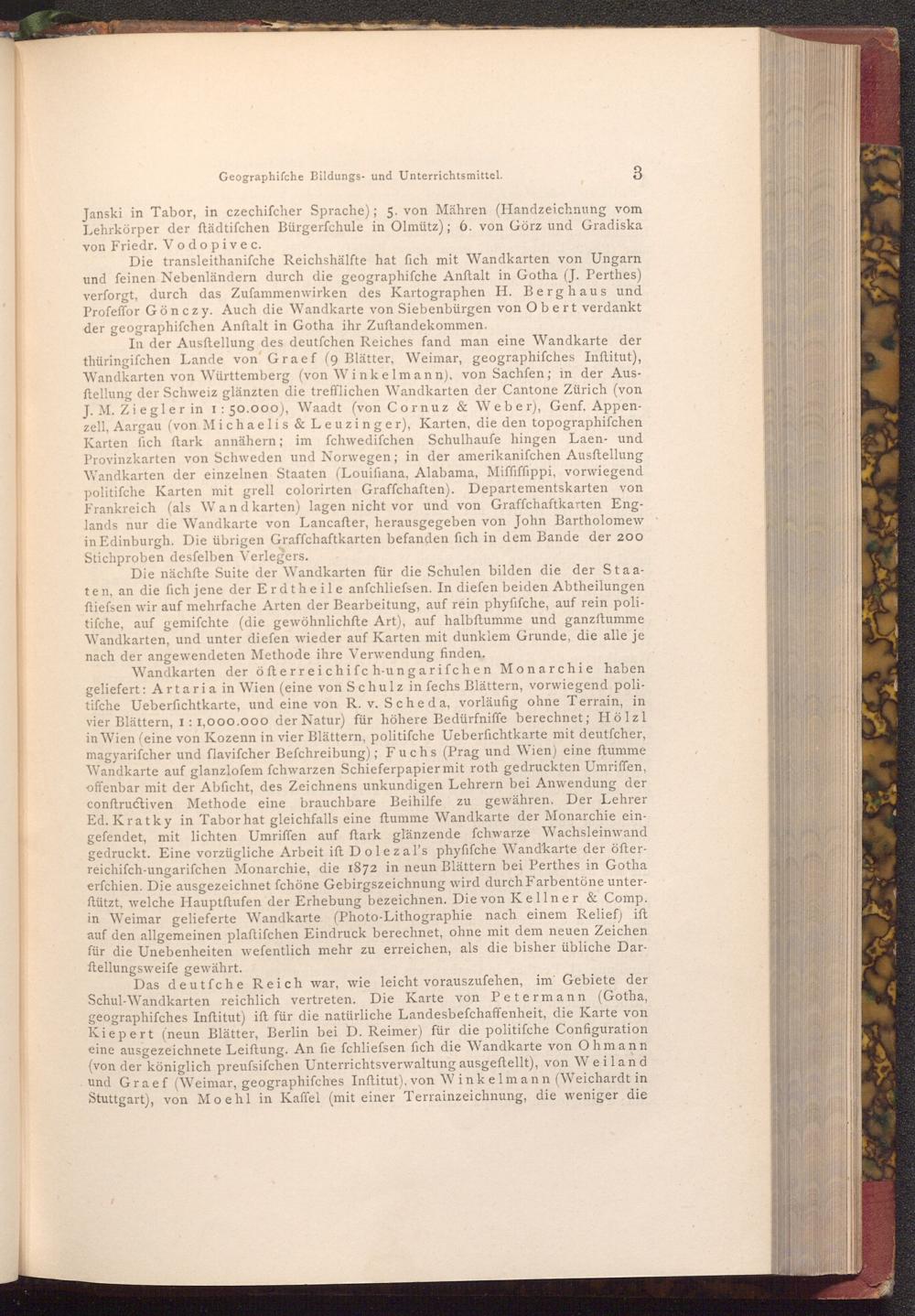 In der Ausftellung des deutfchen Reiches fand man eine Wandkarte der thüringifchen Lande von Graef( 9 Blätter, Weimar, geographifches Inftitut), Wandkarten von Württemberg( von Winkelmann), von Sachfen; in der Ausftellung der Schweiz glänzten die trefflichen Wandkarten der Cantone Zürich( von J. M. Ziegler in 1: 50.000), Waadt( von Cornuz& Weber), Genf, Appenzell, Aargau( von Michaelis& Leuzinger), Karten, die den topographifchen Karten fich ftark annähern; im fchwedifchen Schulhaufe hingen Laen- und Provinzkarten von Schweden und Norwegen; in der amerikanifchen Ausftellung Wandkarten der einzelnen Staaten( Louifiana, Alabama, Miffiffippi, vorwiegend politifche Karten mit grell colorirten Graffchaften). Departementskarten von Frankreich( als Wandkarten) lagen nicht vor und von Graffchaftkarten Englands nur die Wandkarte von Lancaſter, herausgegeben von John Bartholomew in Edinburgh. Die übrigen Graffchaftkarten befanden fich in dem Bande der 200 Stichproben desfelben Verlegers.