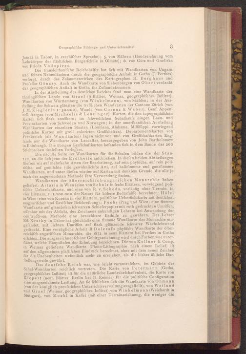 Das deutfche Reich war, wie leicht vorauszufehen, im Gebiete der Schul- Wandkarten reichlich vertreten. Die Karte von Petermann( Gotha, geographifches Inftitut) ift für die natürliche Landesbefchaffenheit, die Karte von Kiepert( neun Blätter, Berlin bei D. Reimer) für die politifche Configuration eine ausgezeichnete Leiftung. An fie fchliefsen fich die Wandkarte von Ohmann ( von der königlich preuſsifchen Unterrichtsverwaltung ausgeftellt), von Weiland und Graef( Weimar, geographifches Inftitut), von Winkelmann( Weichardt in Stuttgart), von Moehl in Kaffel( mit einer Terrainzeichnung, die weniger die