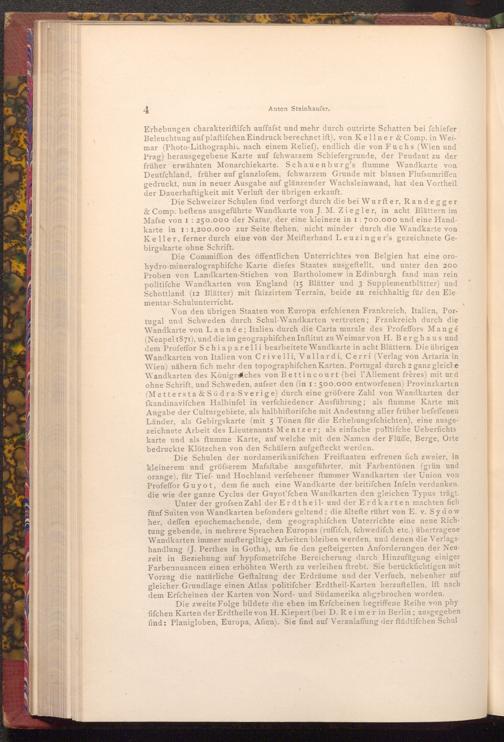 Die Schweizer Schulen find verforgt durch die bei Wurfter, Randegger & Comp. beftens ausgeführte Wandkarte von J. M. Ziegler, in acht Blättern im Mafse von I 250.000 der Natur, der eine kleinere in I: 700.000 und eine Handkarte in 1: 1,200.000 zur Seite ftehen, nicht minder durch die Wandkarte von Keller, ferner durch eine von der Meifterhand Leuzinger's gezeichnete Gebirgskarte ohne Schrift.