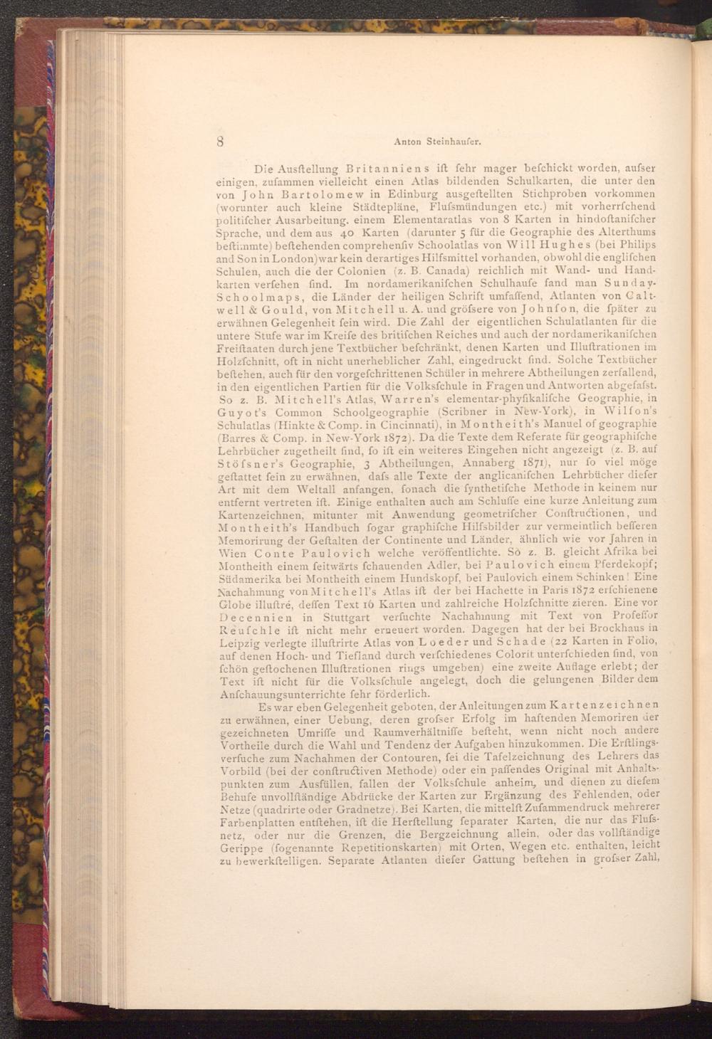 Die Ausftellung Britanniens ift fehr mager befchickt worden, aufser einigen, zufammen vielleicht einen Atlas bildenden Schulkarten, die unter den von John Bartolomew in Edinburg ausgeftellten Stichproben vorkommen ( worunter auch kleine Städtepläne, Flufsmündungen etc.) mit vorherrfchend politifcher Ausarbeitung, einem Elementaratlas von 8 Karten in hindoftanifcher Sprache, und dem aus 40 Karten( darunter 5 für die Geographie des Alterthums beftimmte) beftehenden comprehenfiv Schoolatlas von Will Hughes( bei Philips and Son in London) war kein derartiges Hilfsmittel vorhanden, obwohl die engliſchen Schulen, auch die der Colonien( z. B. Canada) reichlich mit Wand- und Handkarten verfehen find. Im nordamerikanifchen Schulhaufe fand man SundaySchoolmaps, die Länder der heiligen Schrift umfaffend, Atlanten von Caltwell& Gould, von Mitchell u. A. und gröfsere von Johnfon, die später zu erwähnen Gelegenheit fein wird. Die Zahl der eigentlichen Schulatlanten für die untere Stufe war im Kreife des britifchen Reiches und auch der nordamerikaniſchen Freiftaaten durch jene Textbücher befchränkt, denen Karten und Illuftrationen im Holzfchnitt, oft in nicht unerheblicher Zahl, eingedruckt find. Solche Textbücher beſtehen, auch für den vorgefchrittenen Schüler in mehrere Abtheilungen zerfallend, in den eigentlichen Partien für die Volksfchule in Fragen und Antworten abgefafst. So z. B. Mitchell's Atlas, Warren's elementar- phyfikalifche Geographie, in Guyot's Common Schoolgeographie( Scribner in New- York), in Wilfon's Schulatlas( Hinkte& Comp. in Cincinnati), in Montheith's Manuel of geographie ( Barres& Comp. in New- York 1872). Da die Texte dem Referate für geographifche Lehrbücher zugetheilt find, fo ift ein weiteres Eingehen nicht angezeigt( z. B. auf Stöfsner's Geographie, 3 Abtheilungen, Annaberg 1871), nur fo viel möge geftattet fein zu erwähnen, dafs alle Texte der anglicanifchen Lehrbücher diefer Art mit dem Weltall anfangen, fonach die fynthetiſche Methode in keinem nur entfernt vertreten ift. Einige enthalten auch am Schluffe eine kurze Anleitung zum Kartenzeichnen, mitunter mit Anwendung geometrifcher Conftructionen, und Montheith's Handbuch fogar graphifche Hilfsbilder zur vermeintlich befferen Memorirung der Geftalten der Continente und Länder, ähnlich wie vor Jahren in Wien Conte Paulovich welche veröffentlichte. Sò z. B. gleicht Afrika bei Montheith einem feitwärts fchauenden Adler, bei Paulovich einem Pferdekopf; Südamerika bei Montheith einem Hundskopf, bei Paulovich einem Schinken! Eine Nachahmung von Mitchell's Atlas ift der bei Hachette in Paris 1872 erfchienene Globe illuftré, deffen Text 16 Karten und zahlreiche Holzfchnitte zieren. Eine vor Decennien in Stuttgart verfuchte Nachahınung mit Text von Profeffor Reufchle ift nicht mehr erneuert worden. Dagegen hat der bei Brockhaus in Leipzig verlegte illuftrirte Atlas von Loeder und Schade( 22 Karten in Folio, auf denen Hoch- und Tiefland durch verfchiedenes Colorit unterfchieden find, von fchön geftochenen Illuftrationen rings umgeben) eine zweite Auflage erlebt; der Text iſt nicht für die Volksfchule angelegt, doch die gelungenen Bilder dem Anfchauungsunterrichte fehr förderlich.
