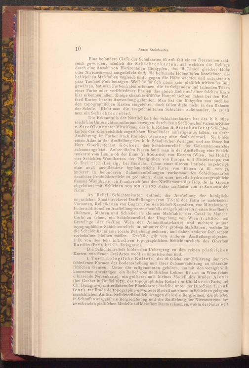 An Relief Schichtenkarten enthielt die Ausftellung der königlichungarifchen Staatsdruckerei Darftellungen( von Tóth) der Tatra in mehrfachen Varianten, Reliefkarten von Ungarn, von den Südoft- Karpathen, von Mitteleuropa. In der additionellen Ausstellung waren ebenfalls einige kleinere Arbeiten Streffleur's ( Böhmen, Mähren und Schlefien in kleinem Mafsftabe, der Canal la Manche, Corfu) zu fehen, ein Schichtenrelief der Umgebung von Wien( 1: 28.800, auf Grundlage der Section Wien der Adminiftrativkarte) und mehrere andere topographifche Schichtenreliefs in mitunter fehr grofsen Mafsftäben, welche für die Schulen kaum eine locale Beziehung nehmen, und daher anderen Referenten vorbehalten bleiben müffen. Dasfelbe gilt von anderen Ausftellungsobjecten, z. B. von den fehr inftructiven topographifchen Schichtenreliefs des Oberften Bardin( Paris, bei Ch. Delagrave).