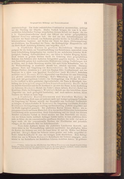 auseinanderliegt. Um diefer unnatürlichen Combination auszuweichen, erübrigt nur die Theilung der Objecte. Diefen Verfuch bringen die vom k. k. öfterreichifchen Schulbücher- Verlage ausgeftellten kleinen Reliefs vor Augen, die das k. k. Unterrichtsminifterium durch den Official des militär geographifchen Inftitutes Pauliny anfertigen liefs. Sie find aus den Aufnahmsmappen auf 1: 72.000 der Natur reducirt, von Beikarten gleicher Gröfse( in Schraffen und mit Schichtenlinien) begleitet, und ftellen ein Stück der Alpen( Ortlerumgebung) mit Gletfchern, den Haupttheil der Tatra, das Riefengebirge( Kuppenform) und ein Stück Karft( Adelsberg- Zirknitz), nun vergriffen, vor*.