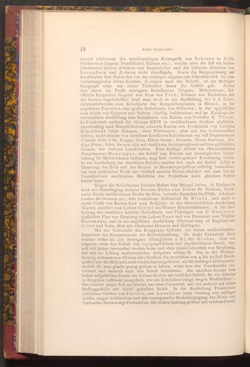 Mögen die Reliefkarten kleinen Maſses ihre Mängel haben, fo bleiben fie doch mit Hinzufügung anderer Zeichen( Fäden oder Drähte für Strafsen, Stecknadel- Köpfe verfchiedener Gröfse für Orte, vertiefte Rinnchen für Flüffe, erhabene Punkte für Grenzen etc.) fehr brauchbare Hilfsmittel für Blinde, und auch in diefer Claffe von Karten fand man Beiſpiele: in der öfterreichifchen Ausftellung ( Karten, adjuftirt vom Lehrer Glötzl des Wiener Blindeninftitutes), in der Ausftellung des deutfchen Reiches( Reliefkarte von Thüringen von C. Oehlwein, plaftifcher Plan von Hamburg vom Lehrer Panz und von Hannover vom Tifchler Hartmann), und in der englifchen Ausftellung( Physical map of England von Brion und Sohn, 1872 mit erhabenen Grenzen und Gebirgen).
